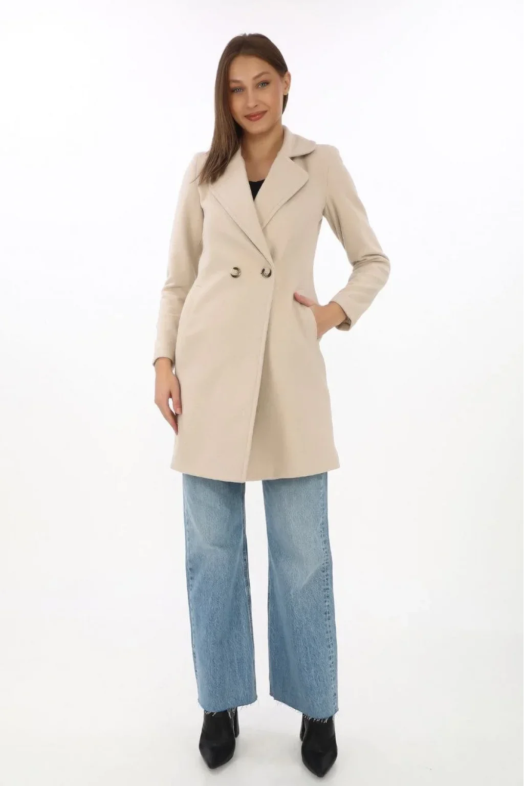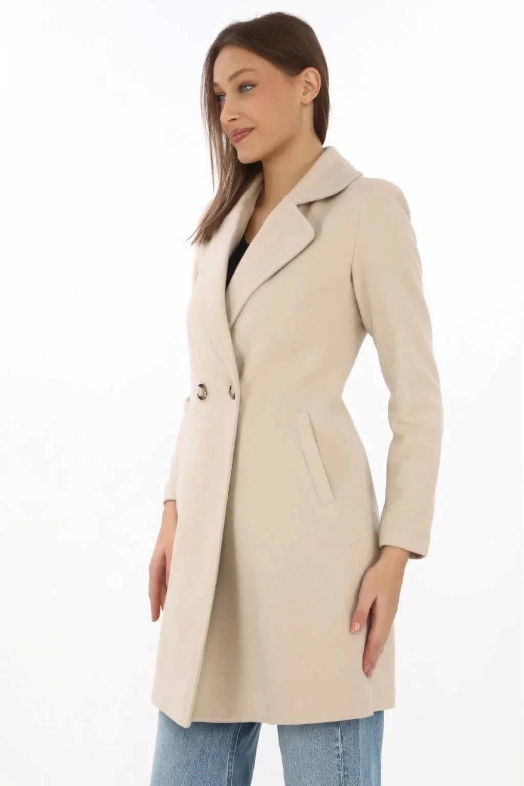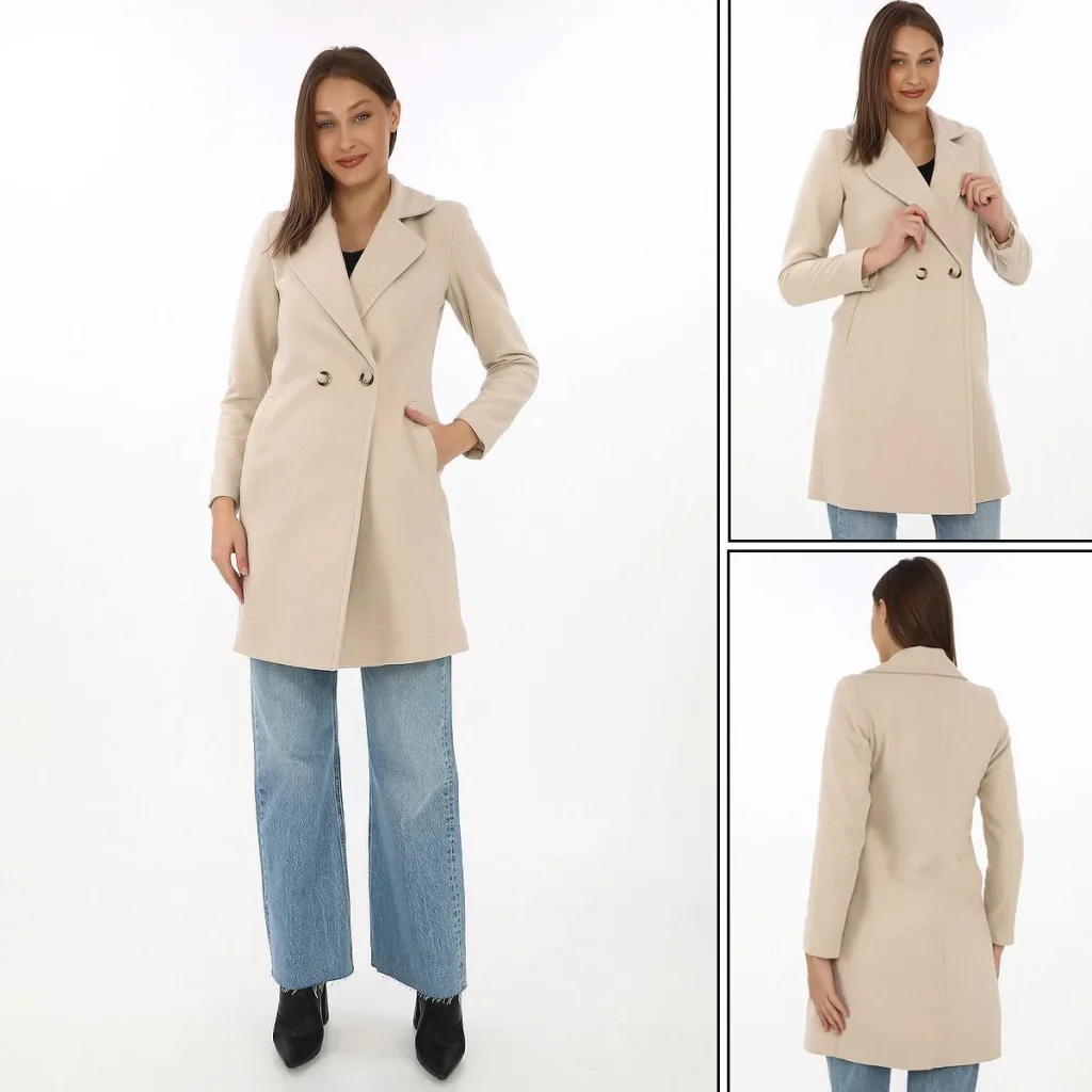 Kadın Kaşe Kaban – Siyah Yünlü Dokuma, Kruvaze Yaka, Astarlı, Cepli, Kuşaklı Uzun Boy Tesettür Uyumlu Kışlık Şık Kaban - Bej