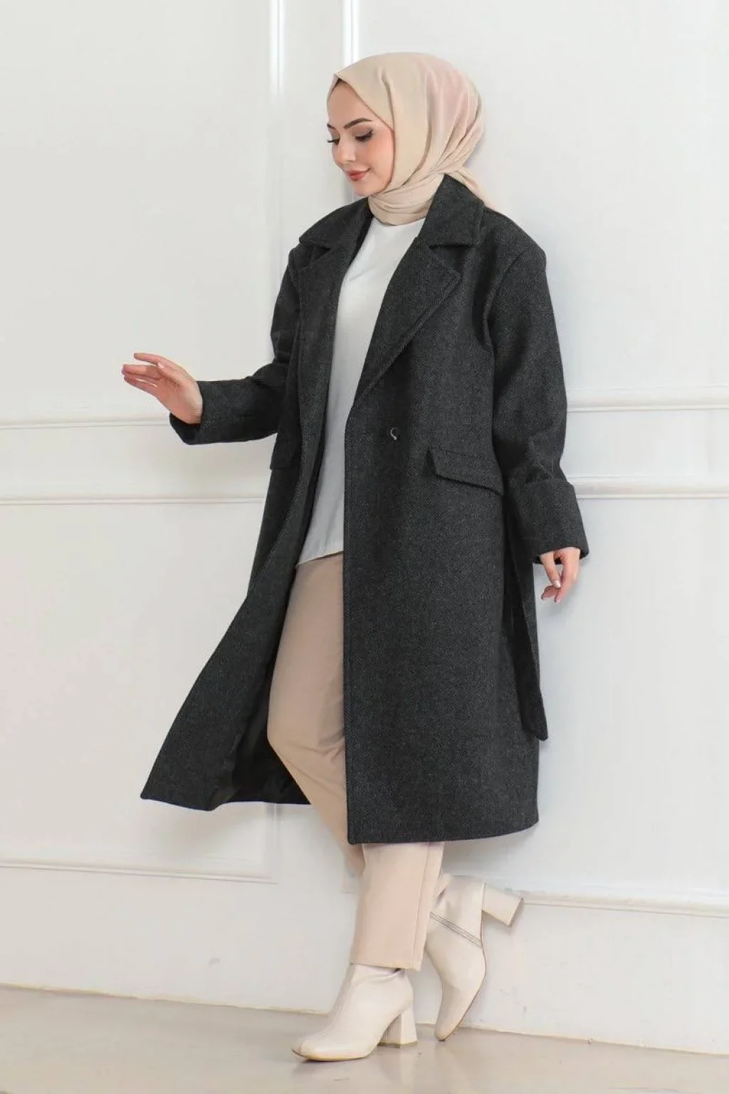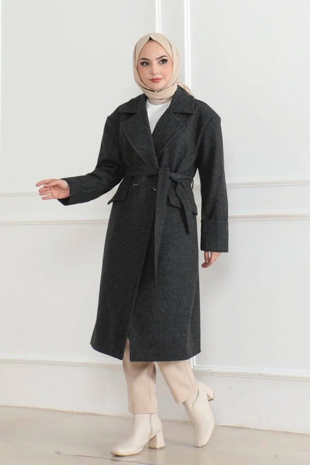 Ürün açıklamasıKış aylarında şıklığı ve sıcaklığı bir arada sunan bu uzun boy kaşe kaban, içi astarlı yapısıyla ekstra konfor sağlarken düğmeli tasarımıyla da modern bir görünüm sunar. %95 kaşe ve %5 akrilik kumaş karışımı ile dayanıklı ve sıcak tutan bu kaban, tesettür giyime uygun olarak tasarlanmıştır. Kruvaze yaka ve beldeki ayarlanabilir kuşak detayı ile vücut hatlarını zarifçe öne çıkarırken, öndeki düğme detayları sayesinde klasik bir şıklık katar. Geniş koleksiyon seçenekleriyle hem günlük hem de özel gün kombinlerinizi tamamlayacak bu kaban, kış gardırobunuzun vazgeçilmezi olacak.