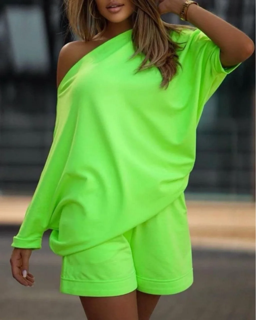 Kadın Kayık Yaka Oversize Asimetrik Bluz Ve şort Iki Iplik Takım