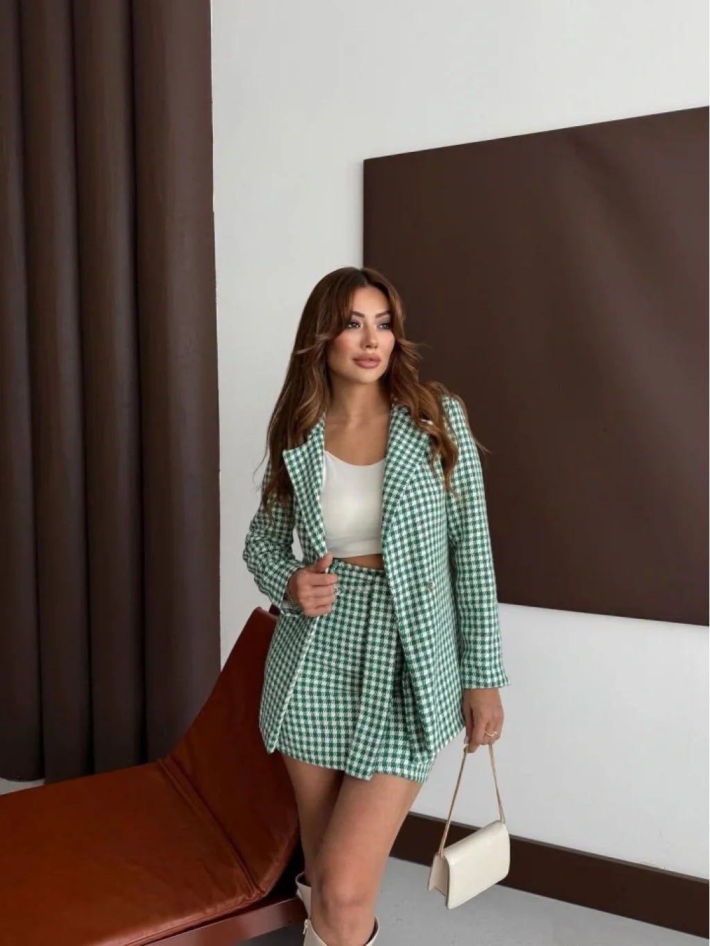 Kadın Kaz Ayağı Desenli Kemerli, Astarlı Vatkalı Ceket 3 Lü Takım