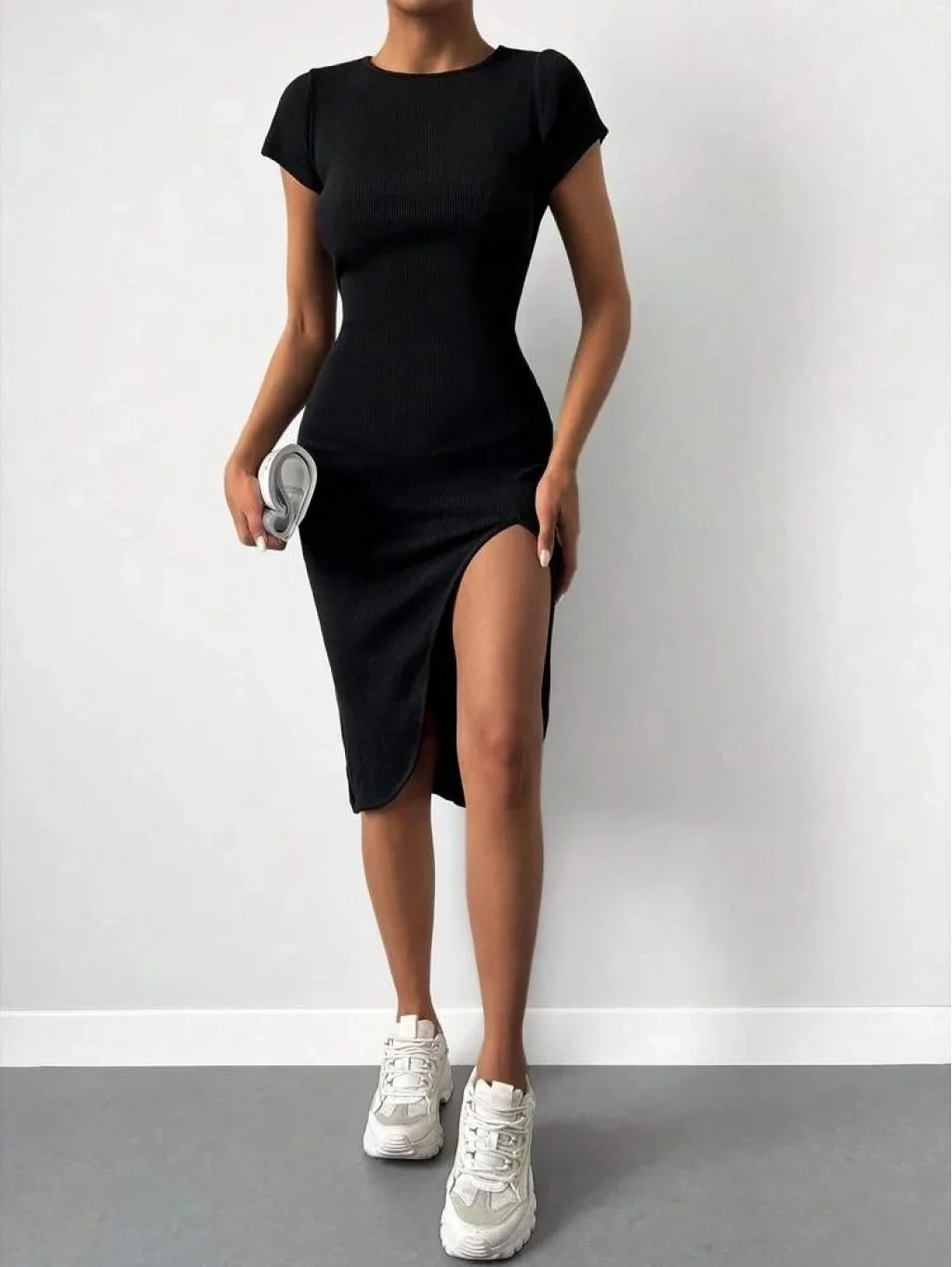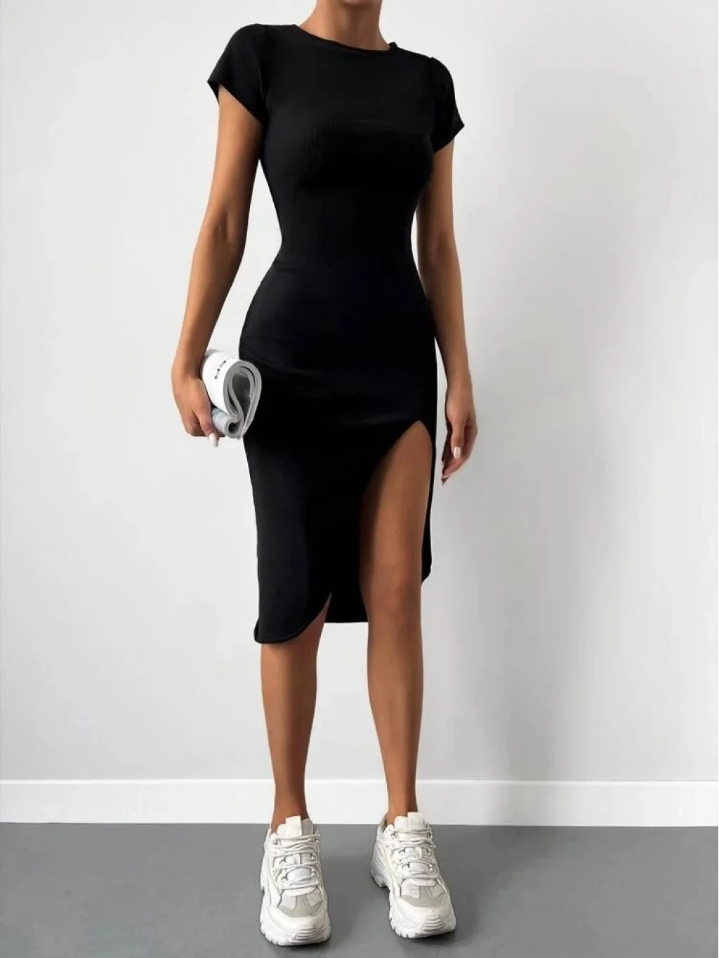 Kadın Kısa Kollu Bisiklet Yaka Derin Yırtmaçlı Kaşkorse Elbise