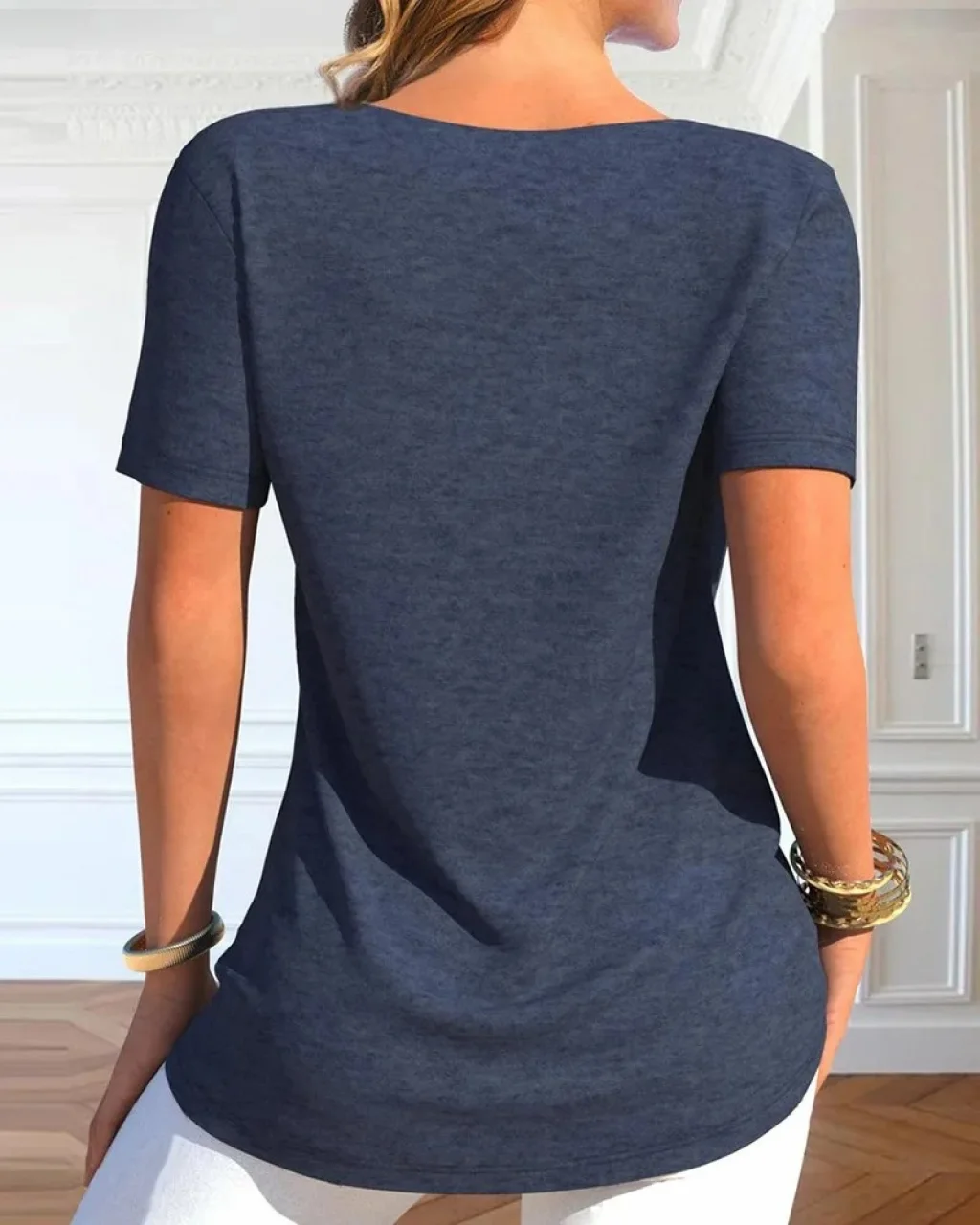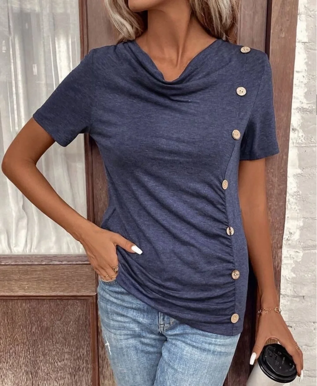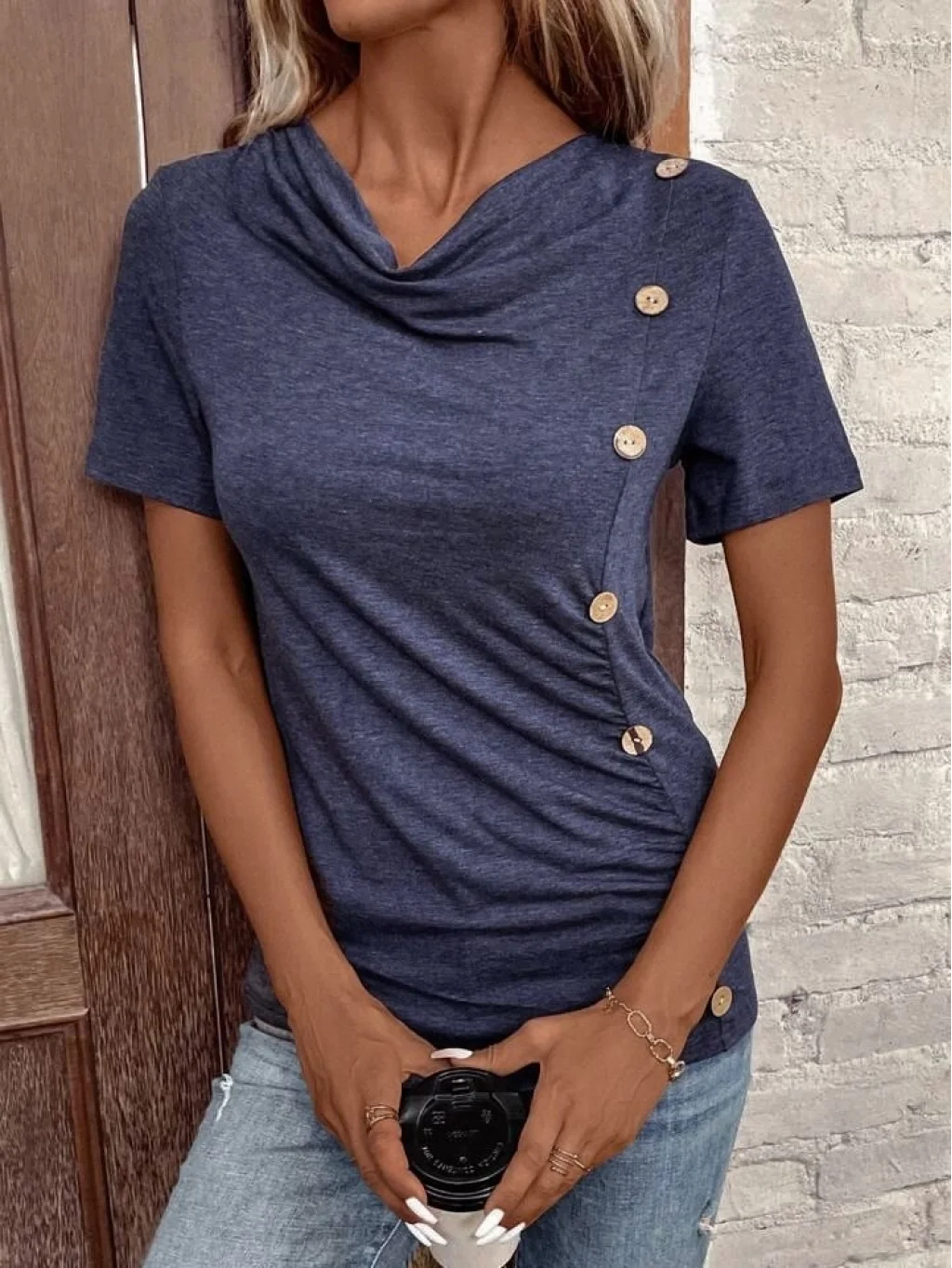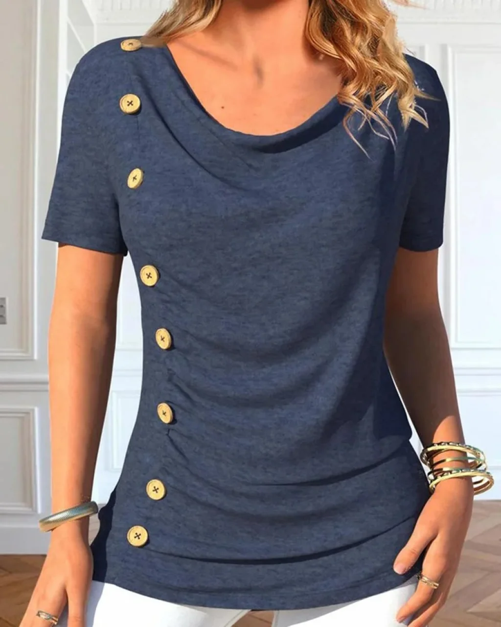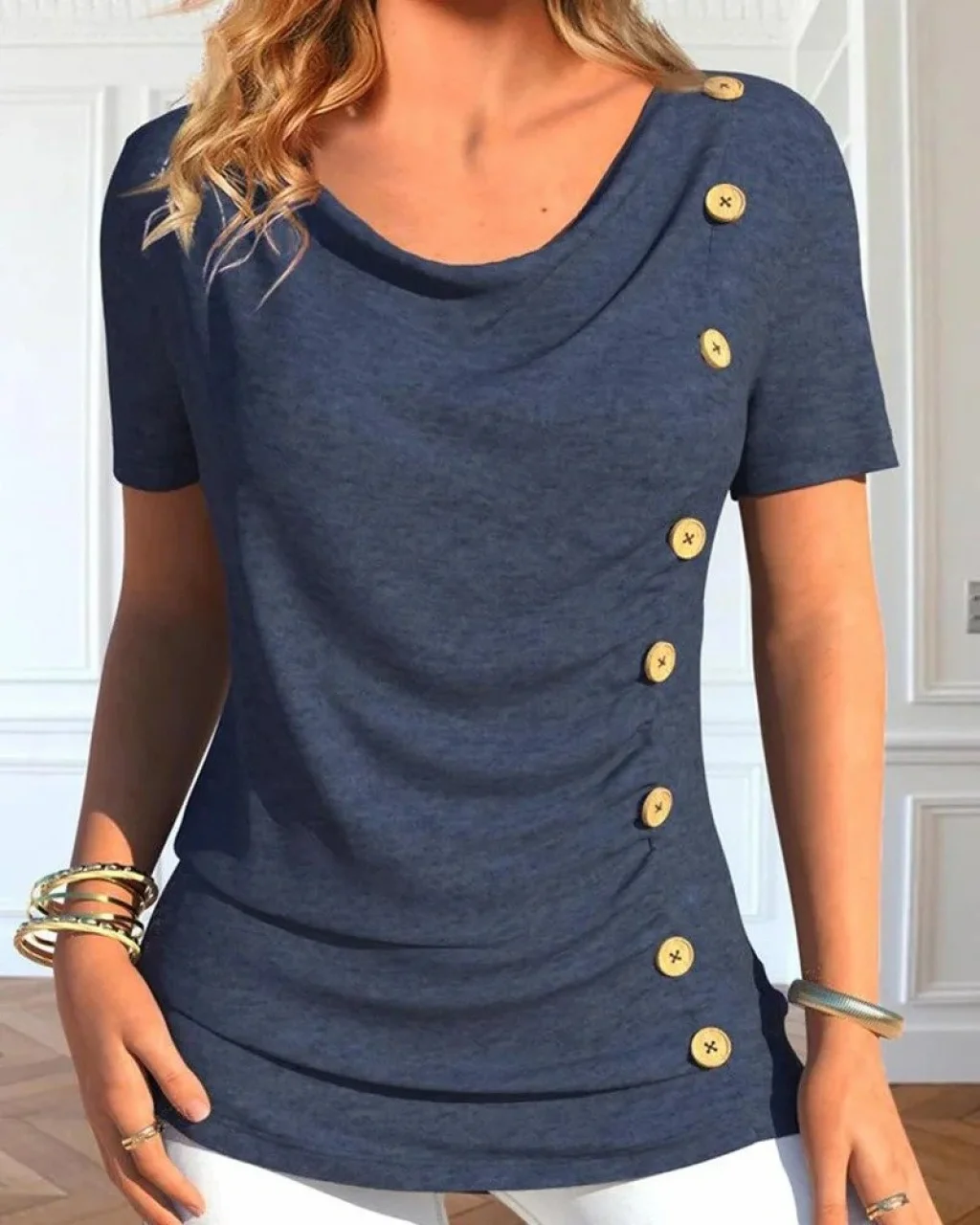 Kadın Kısa Kollu Degaje Yaka Düğme Detay Viskon Bluz