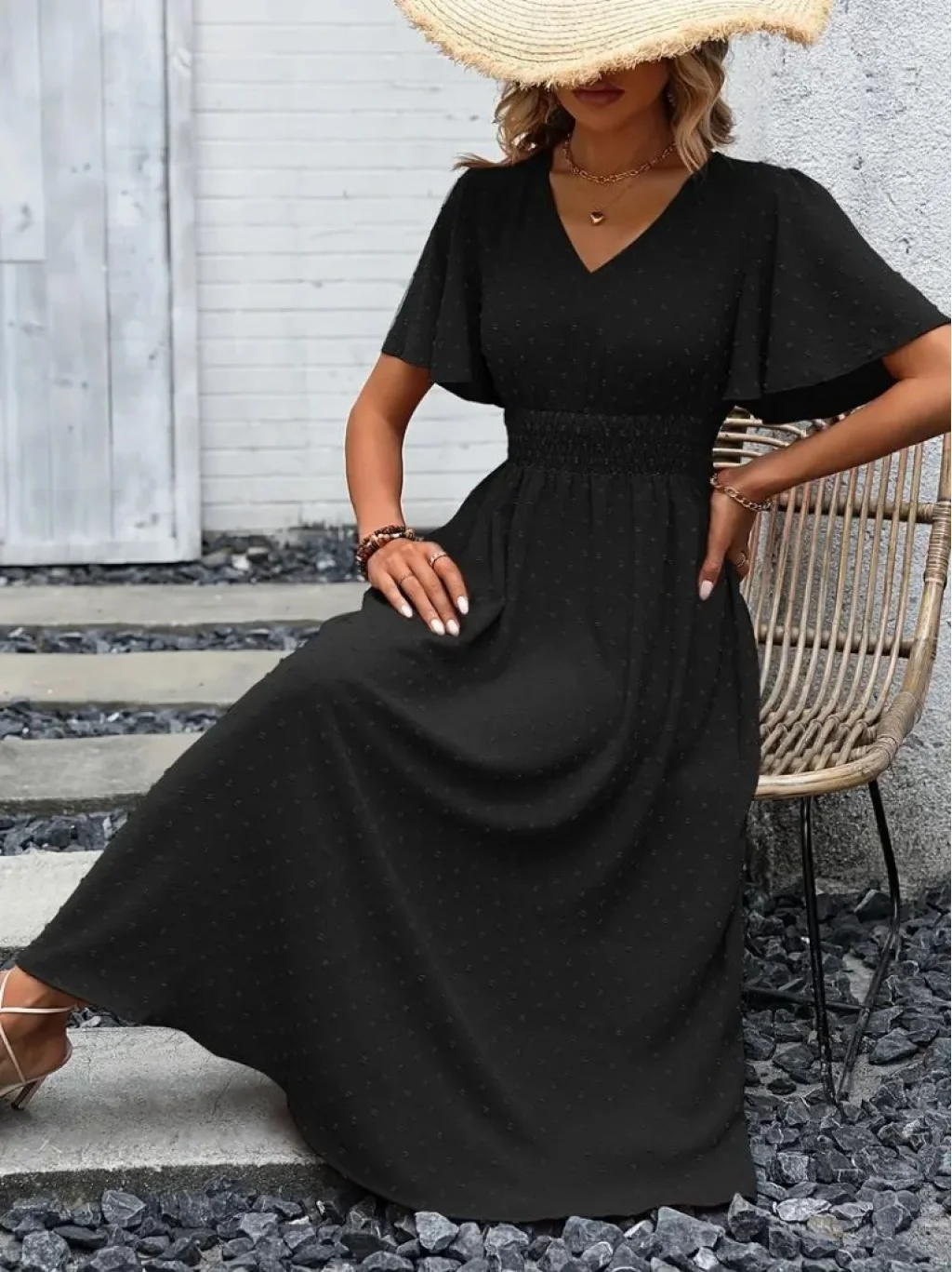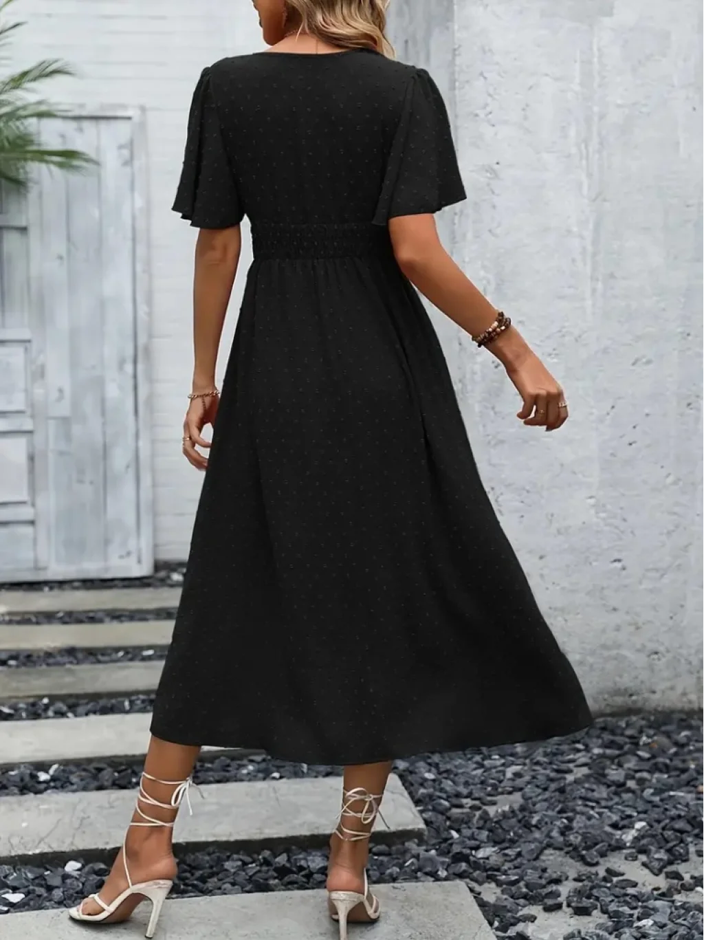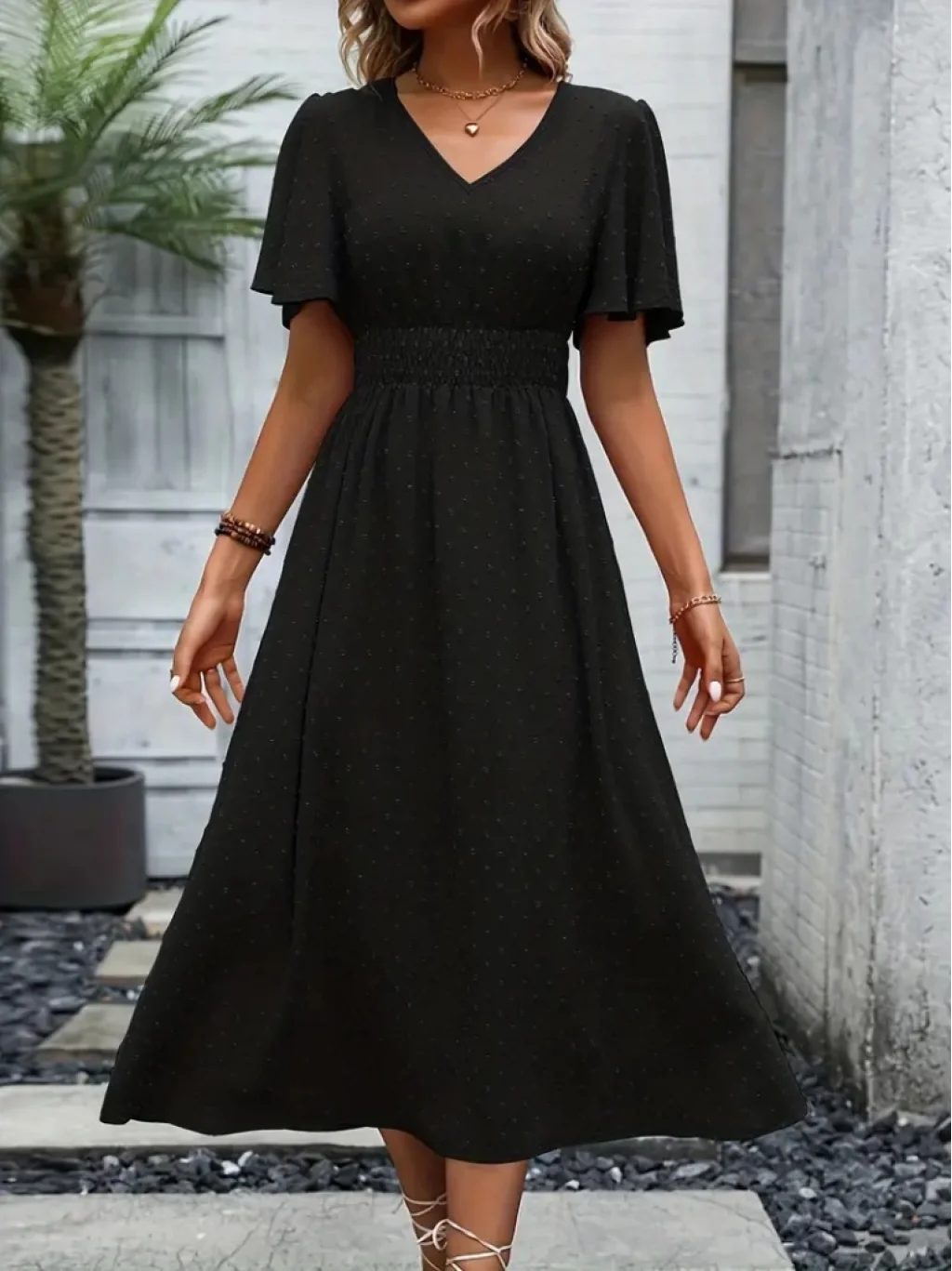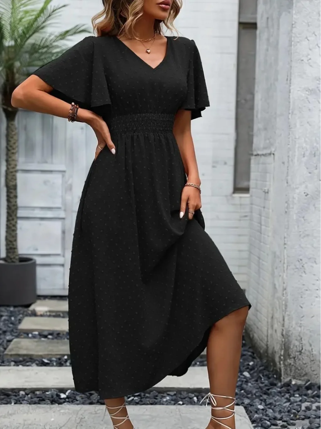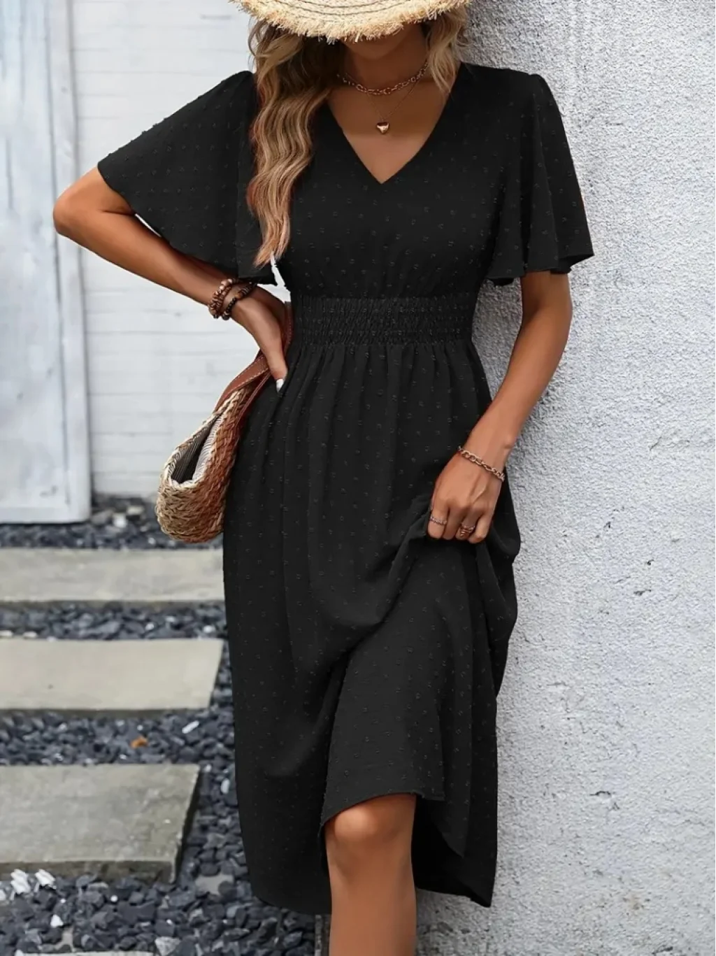 Kadın Kısa Kollu Volanlı Kol Beli Gipeli Jakarlı Vual Midi Boy Elbise