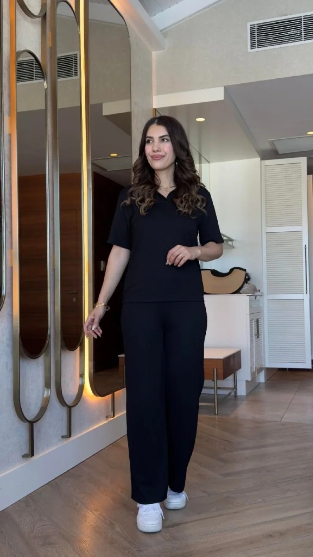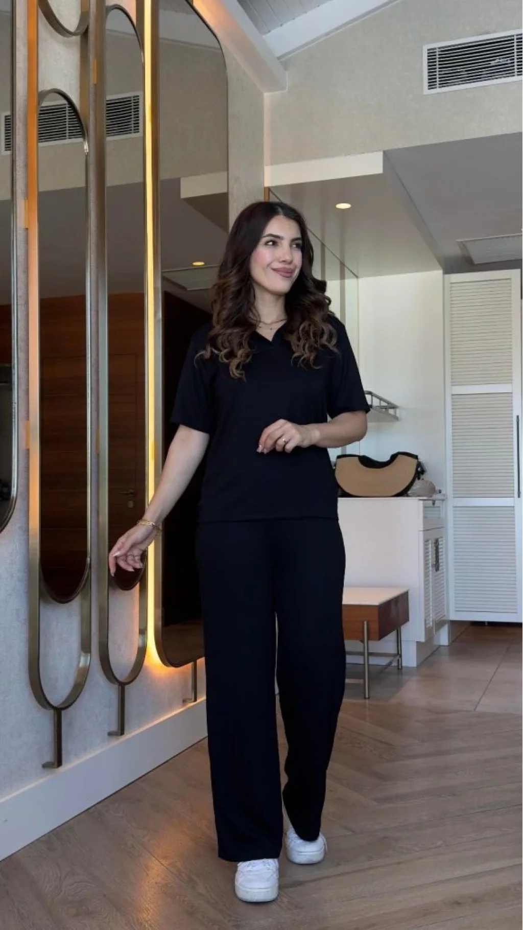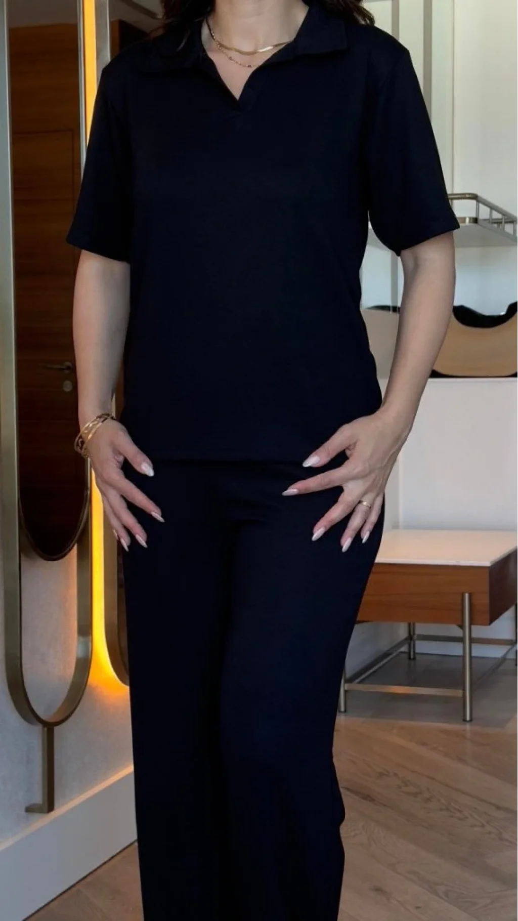 Kadın Kısa Kollu Yakalı Viskon Iki Iplik Bluz Ve Pantolon Ikili Takım