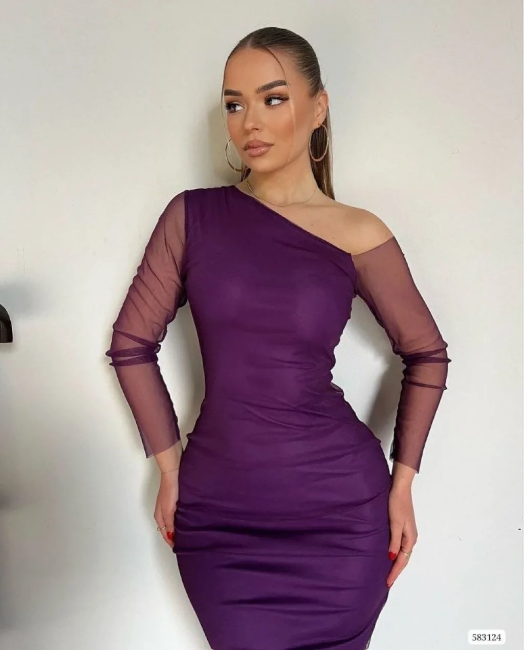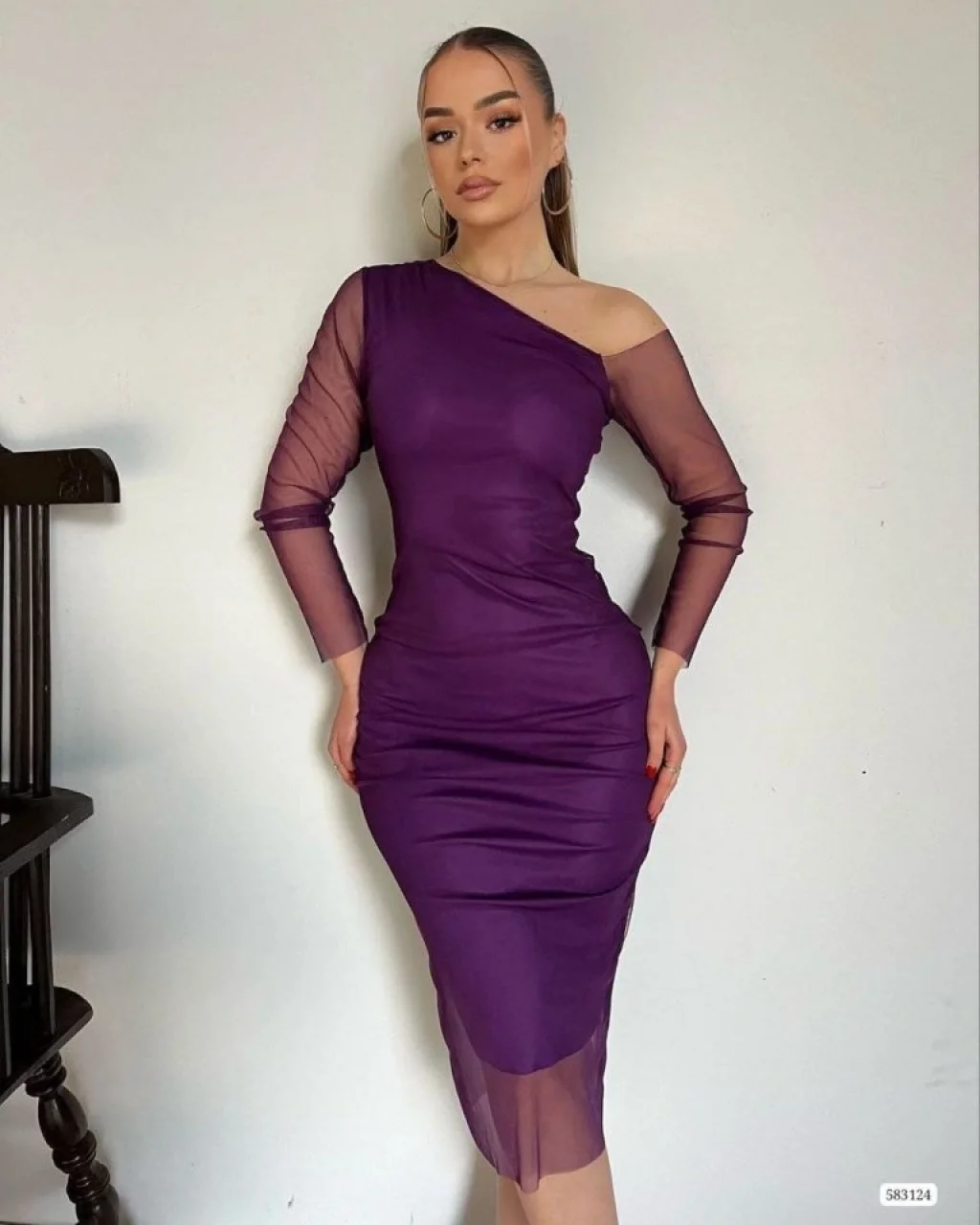 Kadın Kolları Tül Detay Omuz Dekolteli Diz üstü Kalem Elbise