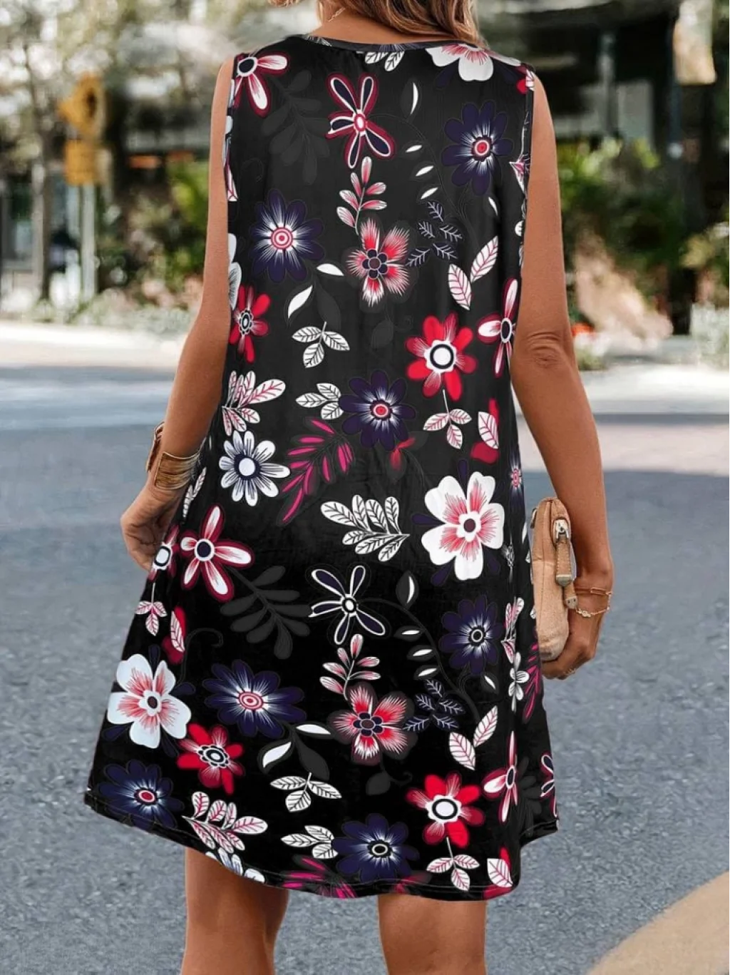 Kadın Kolsuz Renkli çiçek Baskılı Süprem Elbise