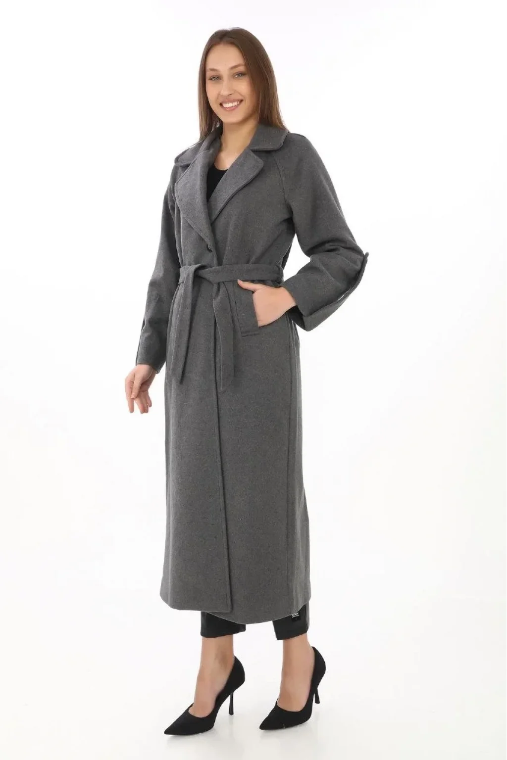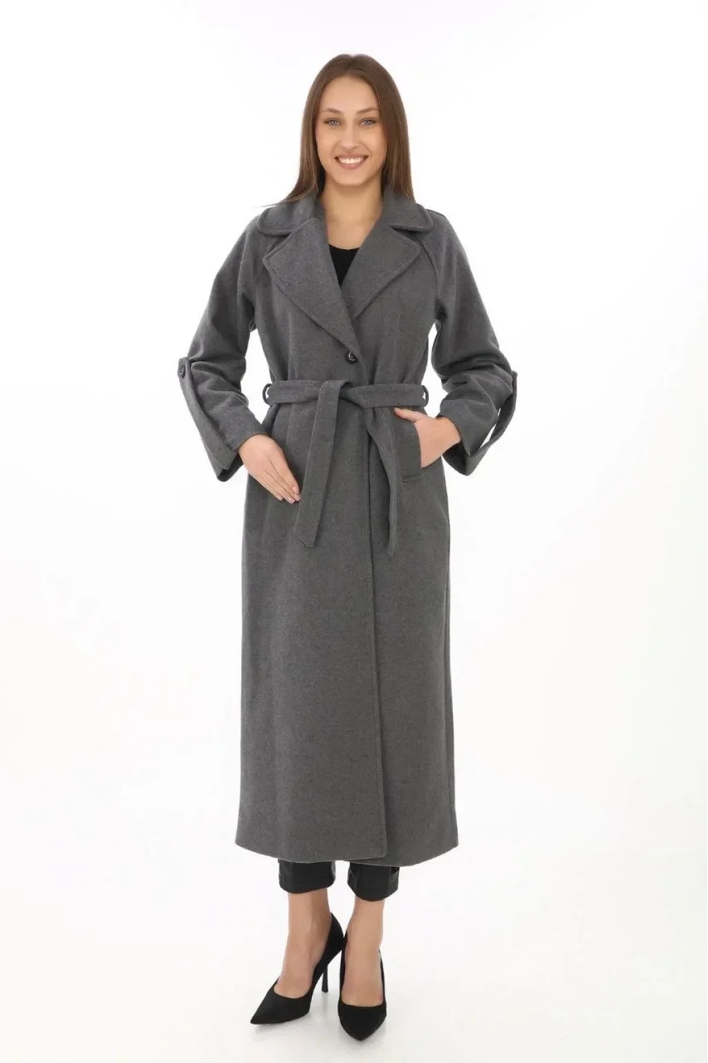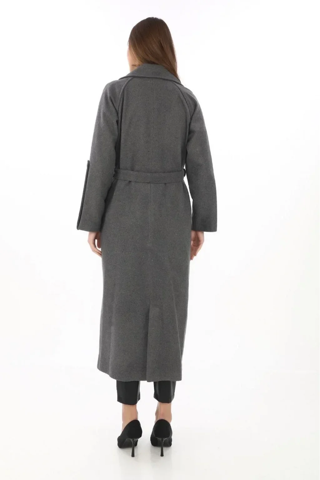 Kadın Kolu Apoletli Astarlı Kaşmir Kaşe Kaban - Füme