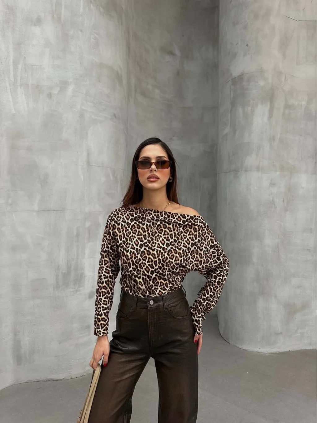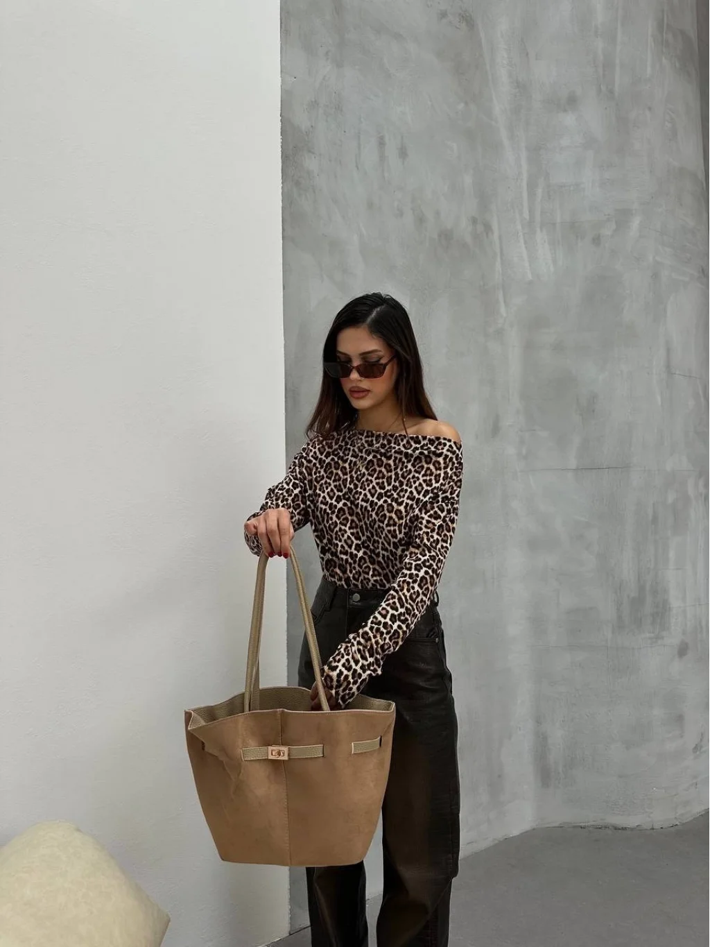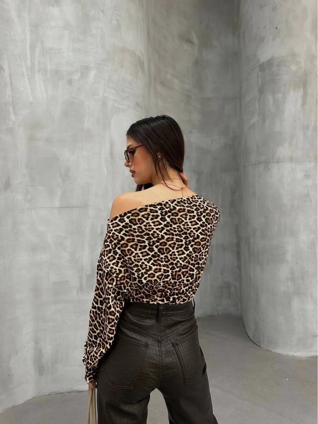 Kadın Leopar Desenli Düşük Omuzlu Bluz