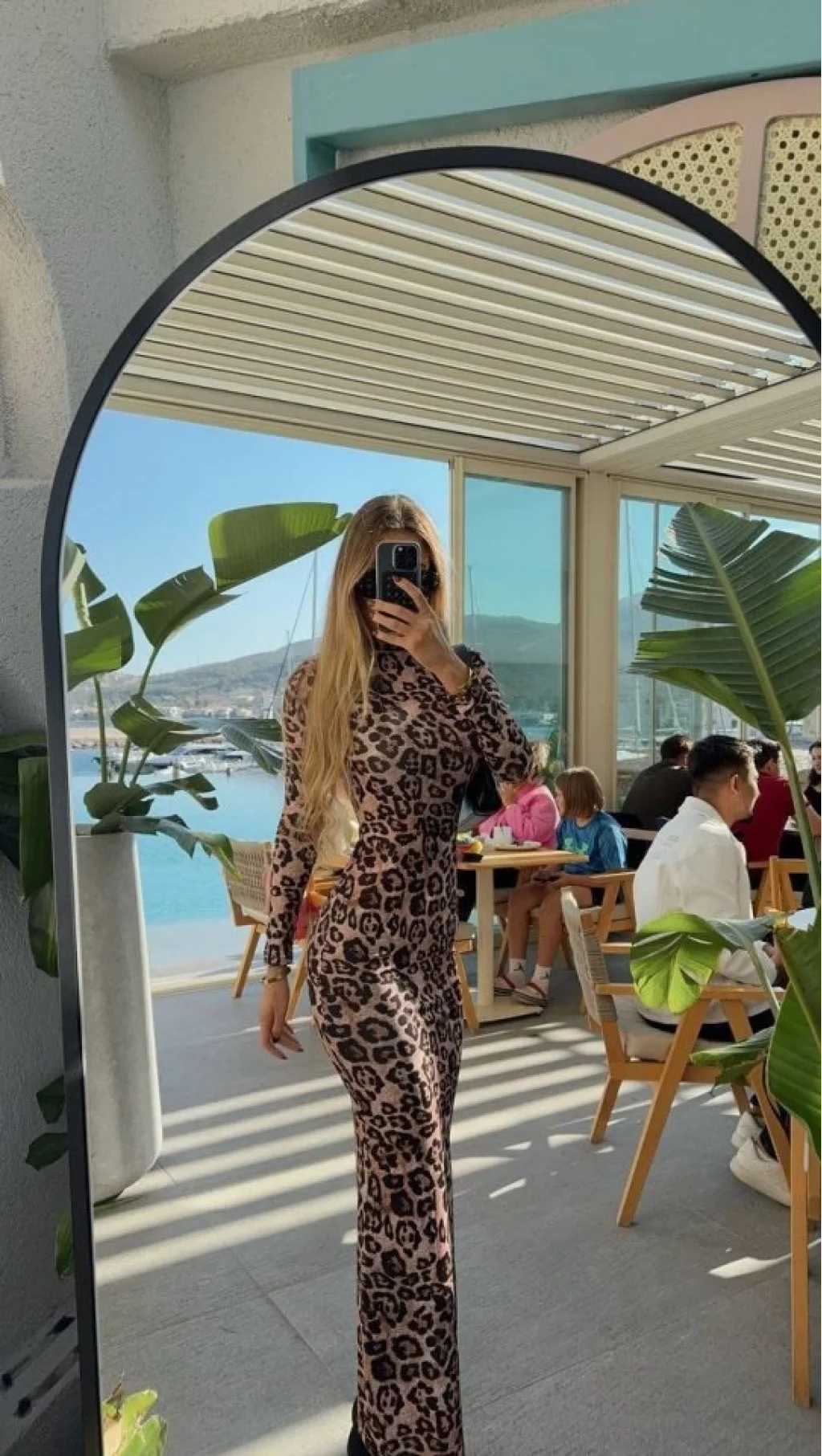 Kadın Leopar Desenli Sırt Dekoltelı Maxı Boy Elbise