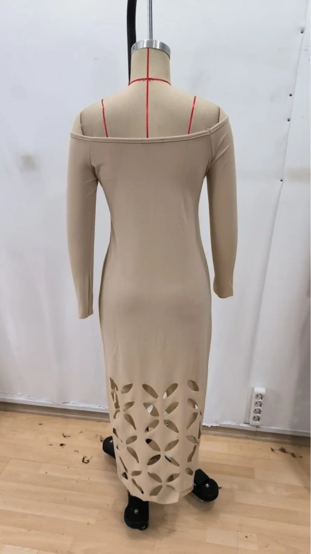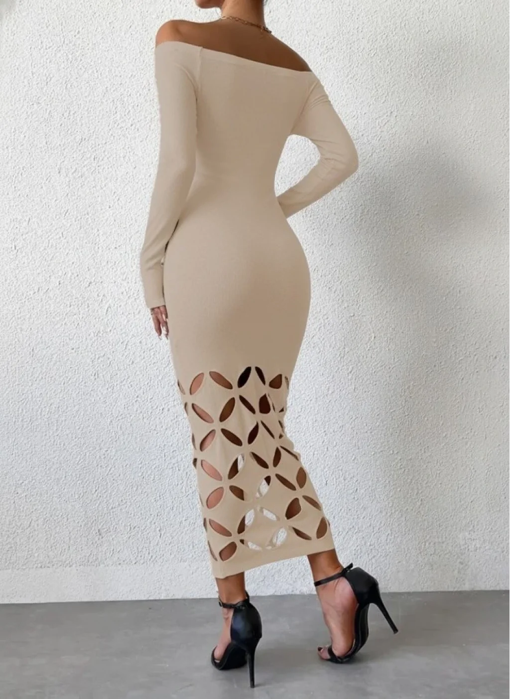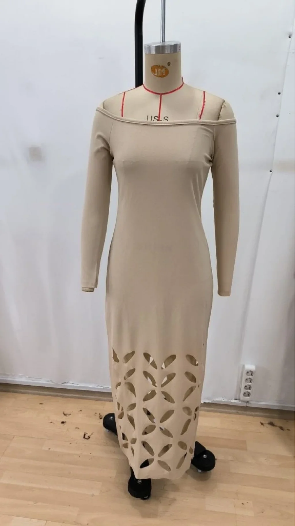 Kadın Madonna Yaka Uzun Kollu Lazer çiçek Kesim Detaylı Uzun Ithal Krep Elbise