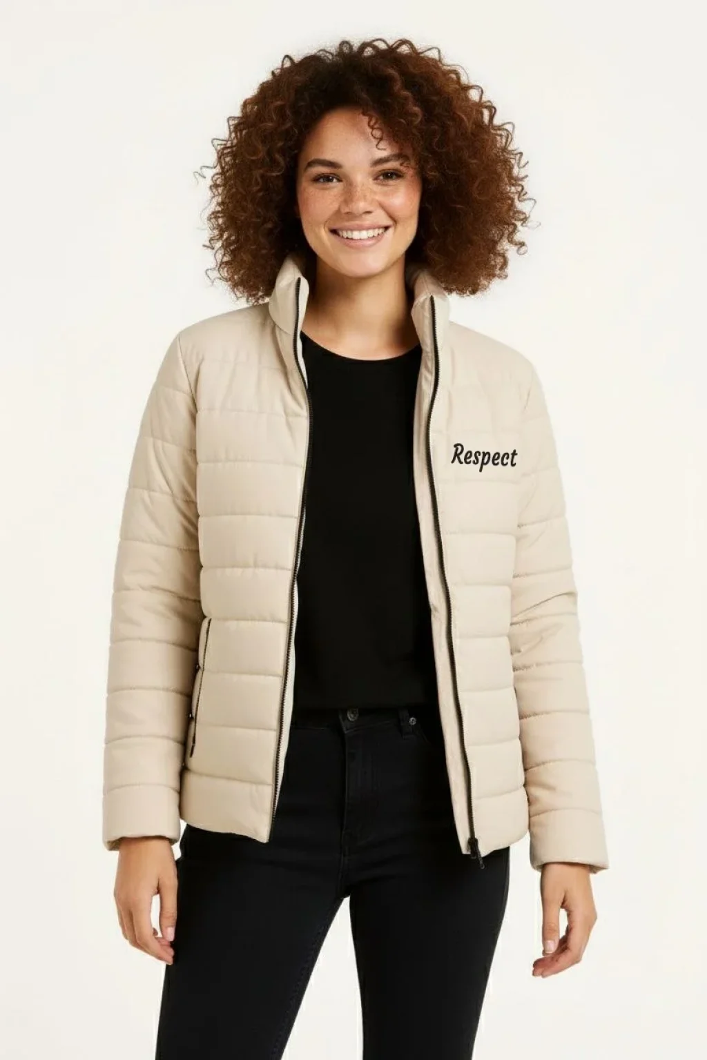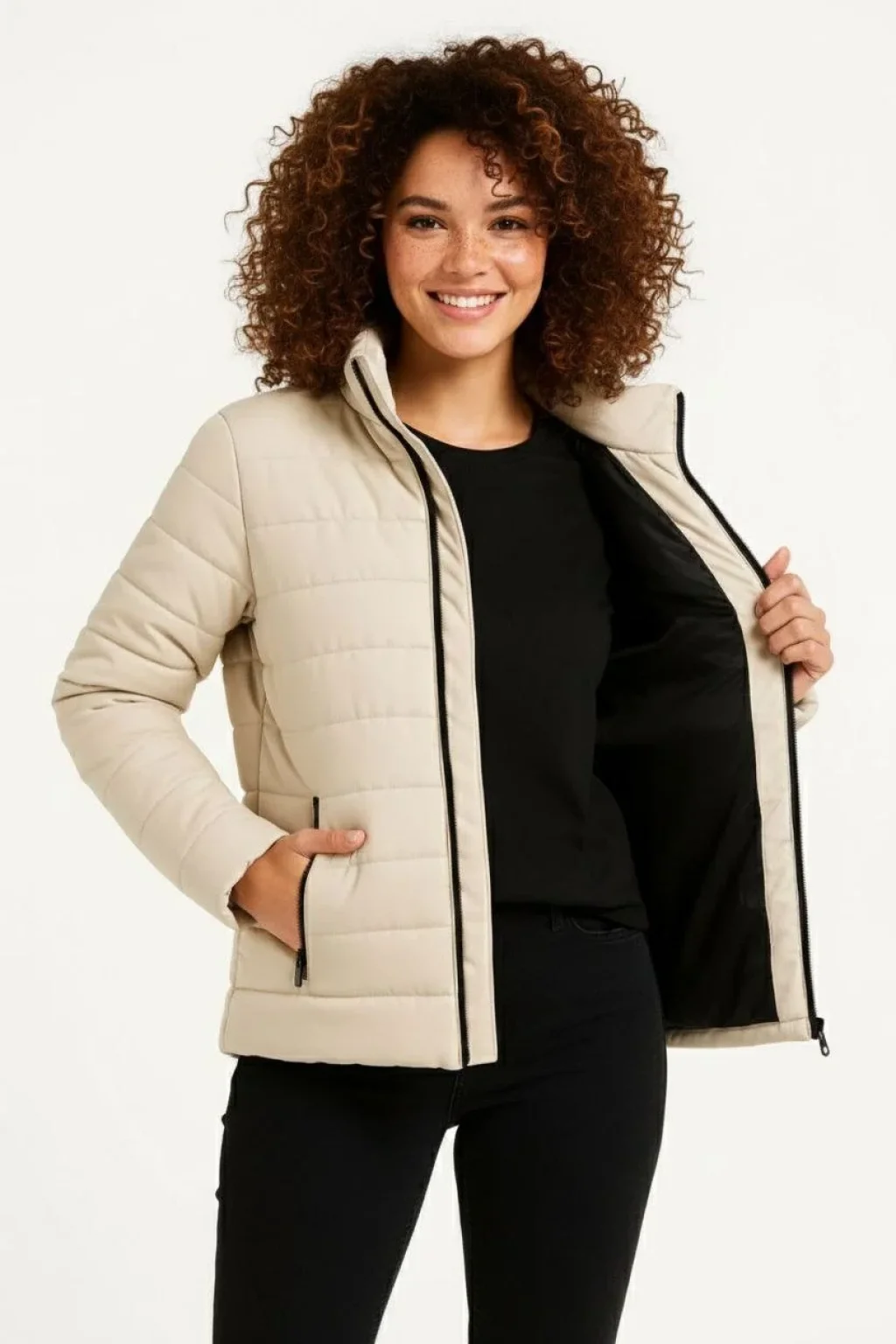 Kadın Mikro Su İtici Kapitone Baskılı Astarlı Fermuarlı Bomber Mont - Bej