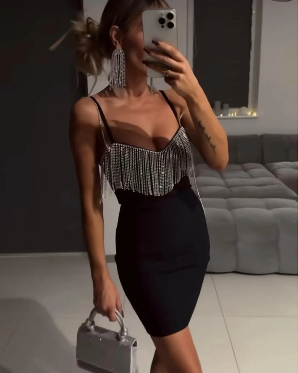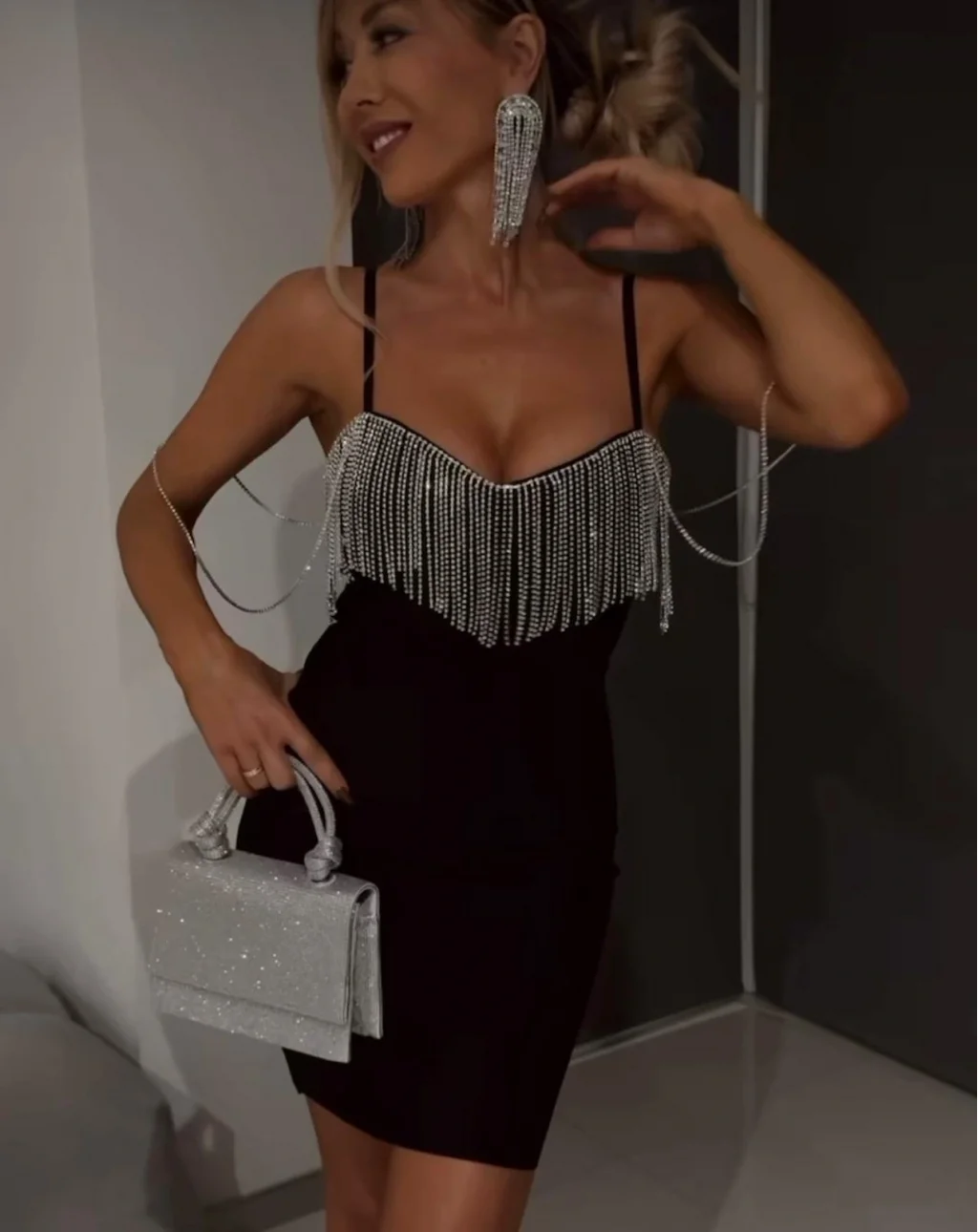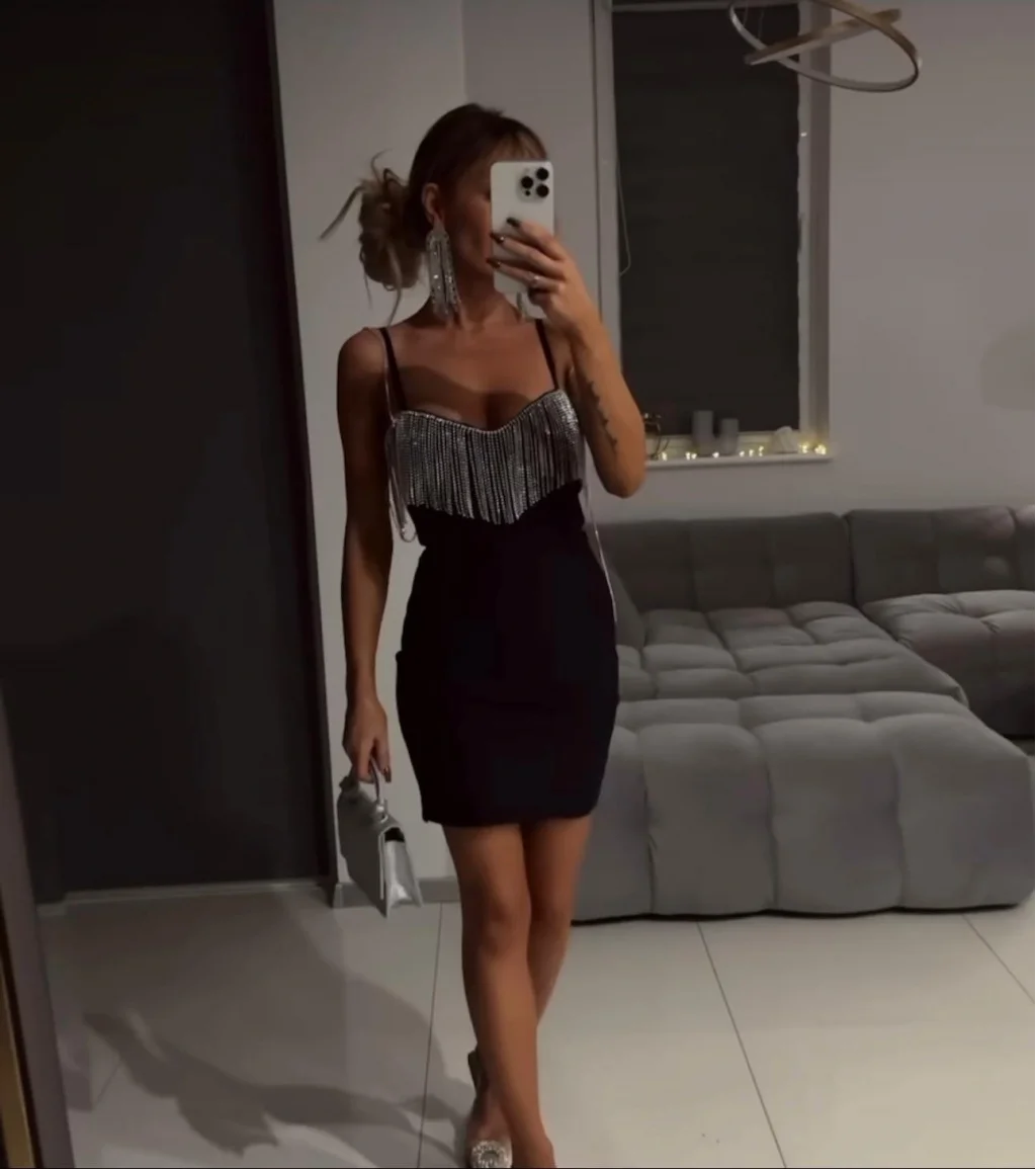 Kadın Omuz Askılı Taş Detay Mini Elbise