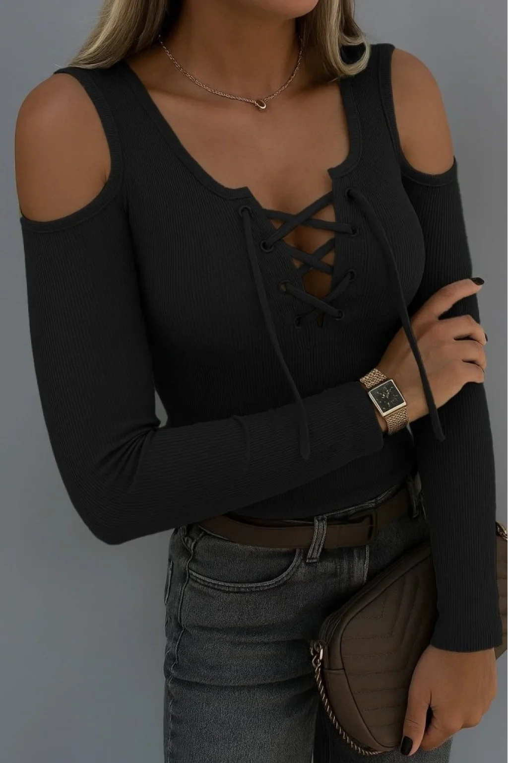 Kadın Omuzlardan Açık Uzun Kollu Bağcıklı Kaşkorse Bluz