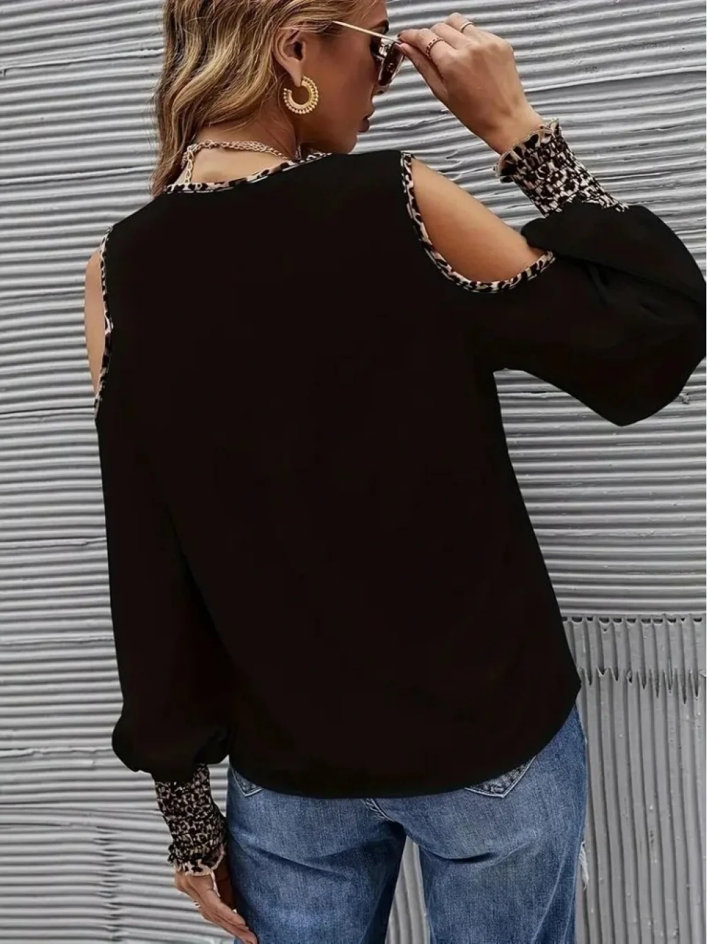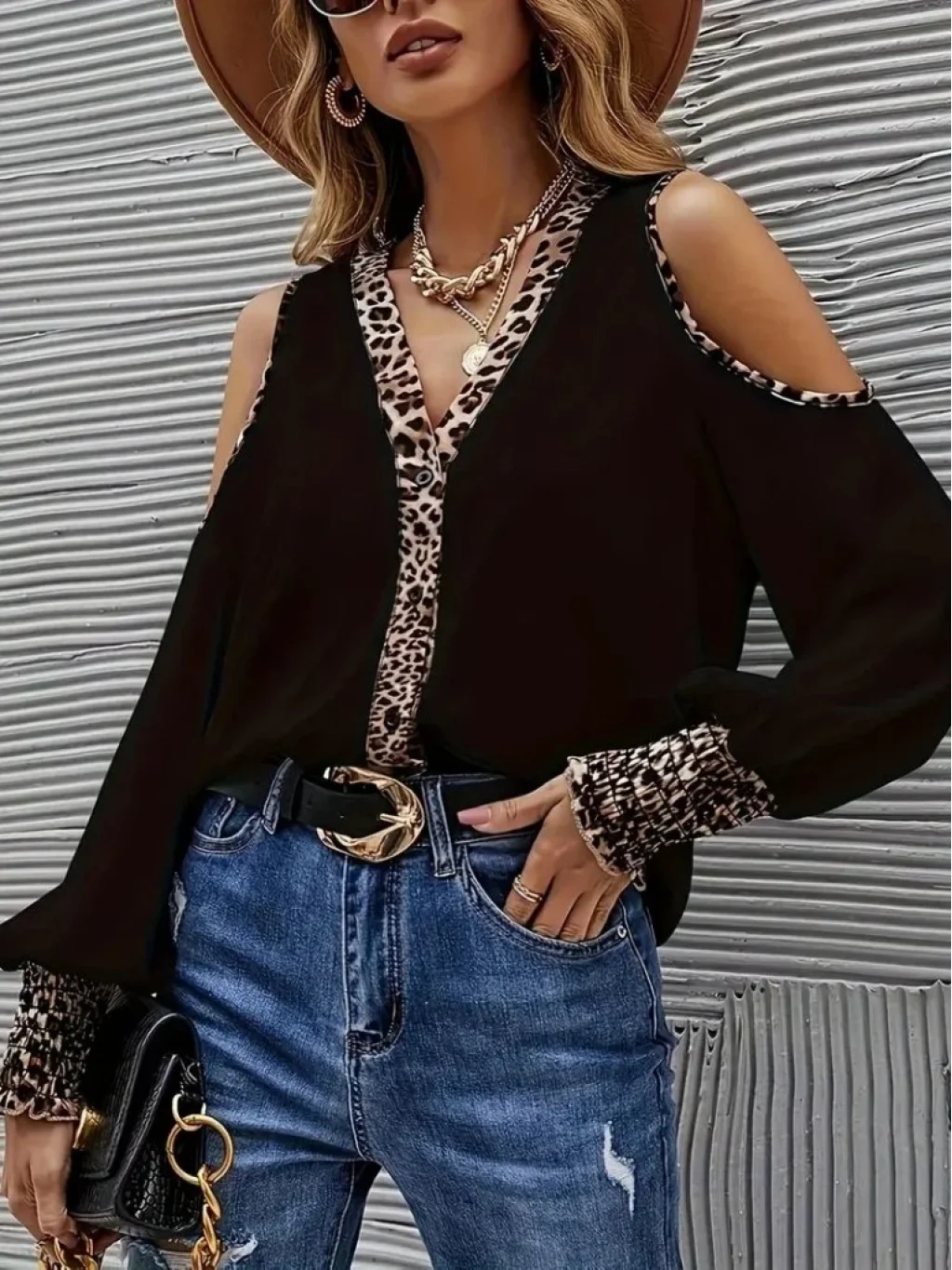 Kadın Omuzlardan Açık Yakalı önden Düğmeli Leopar Detaylı Sandy Bluz