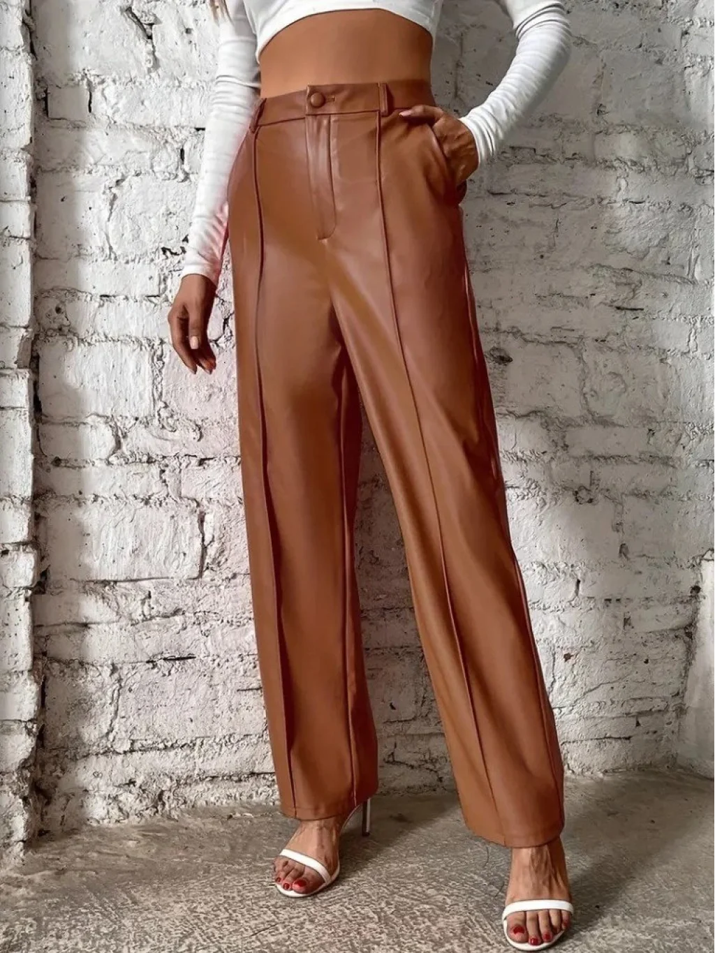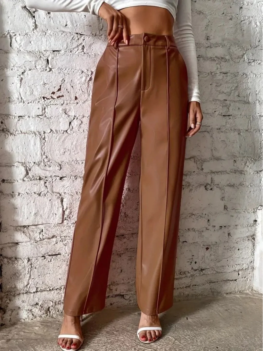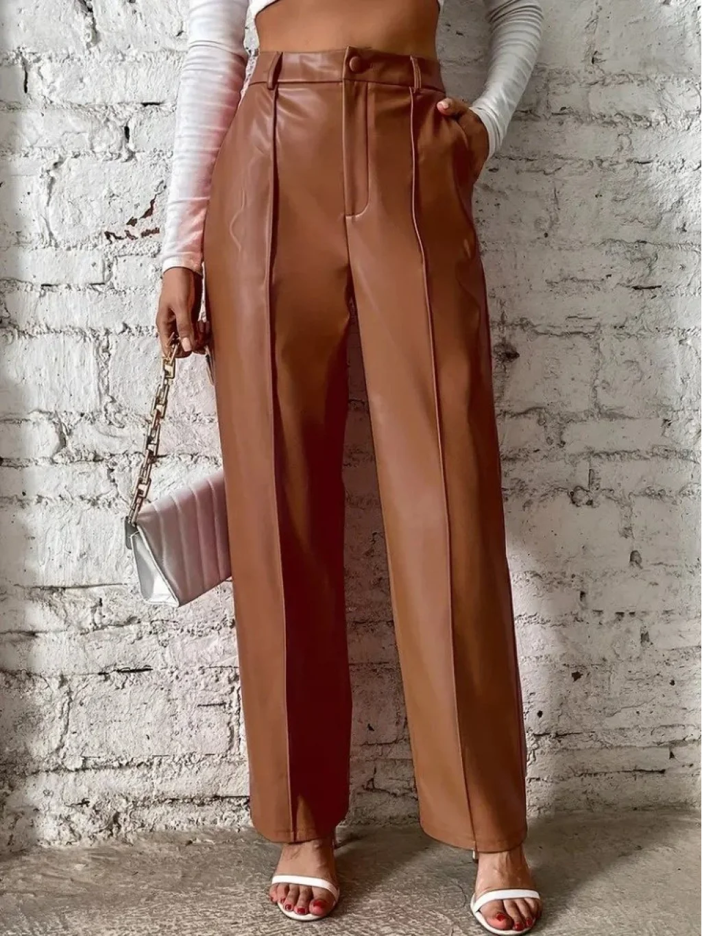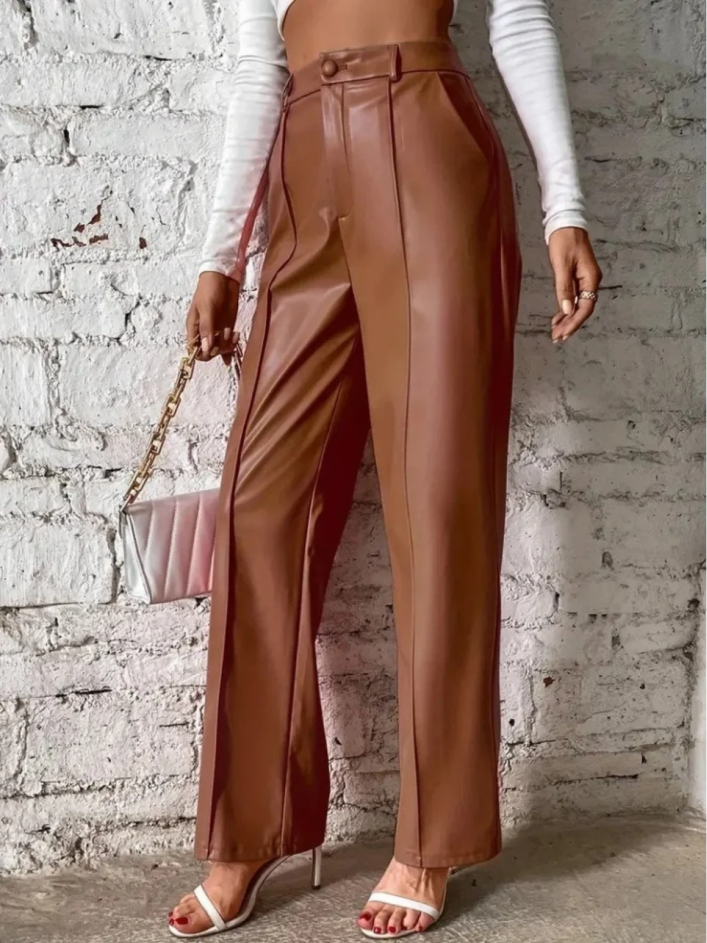 Kadın önden Fermuarlı Cepli Geniş Kesim Lame Deri Pantolon