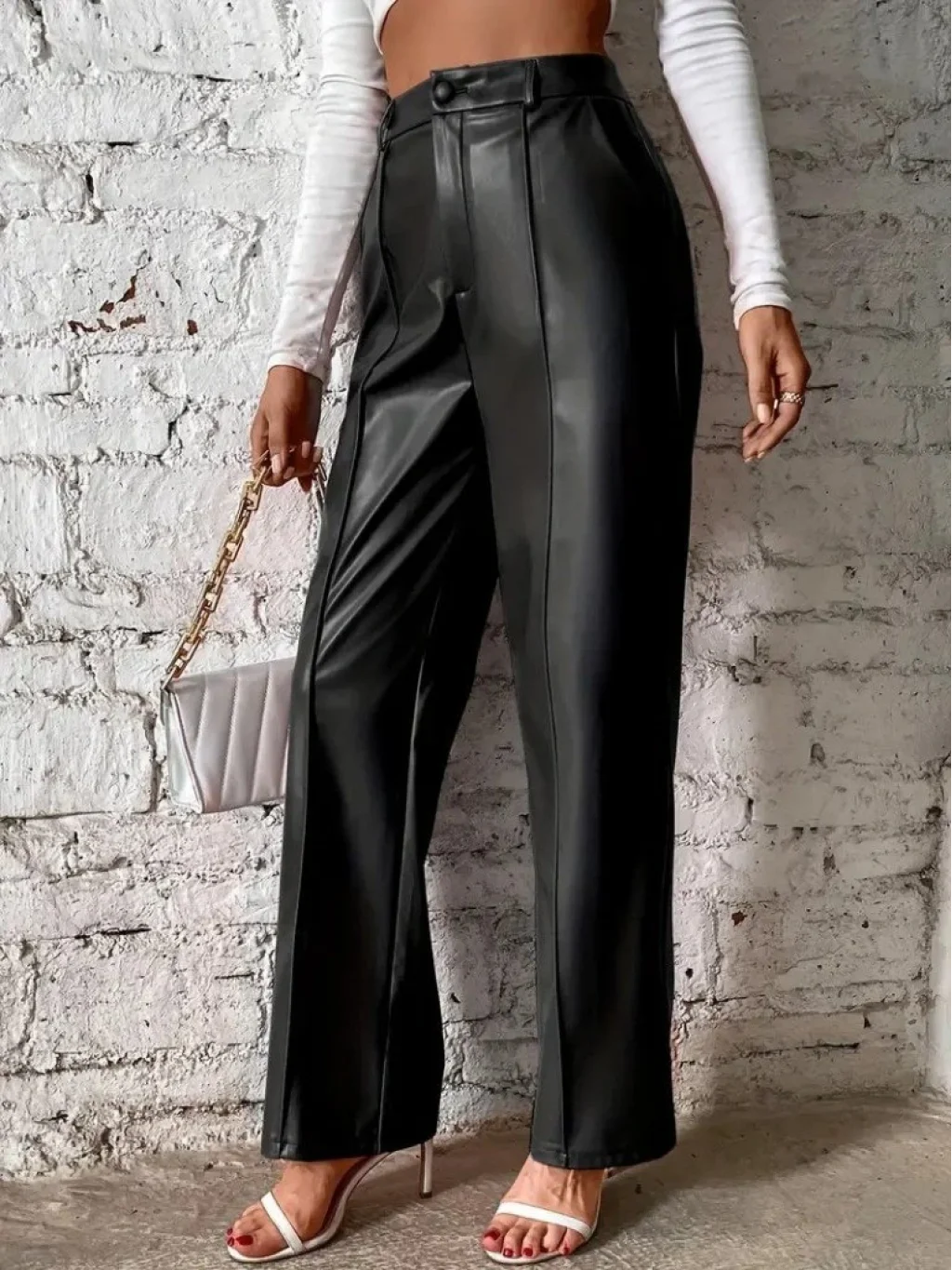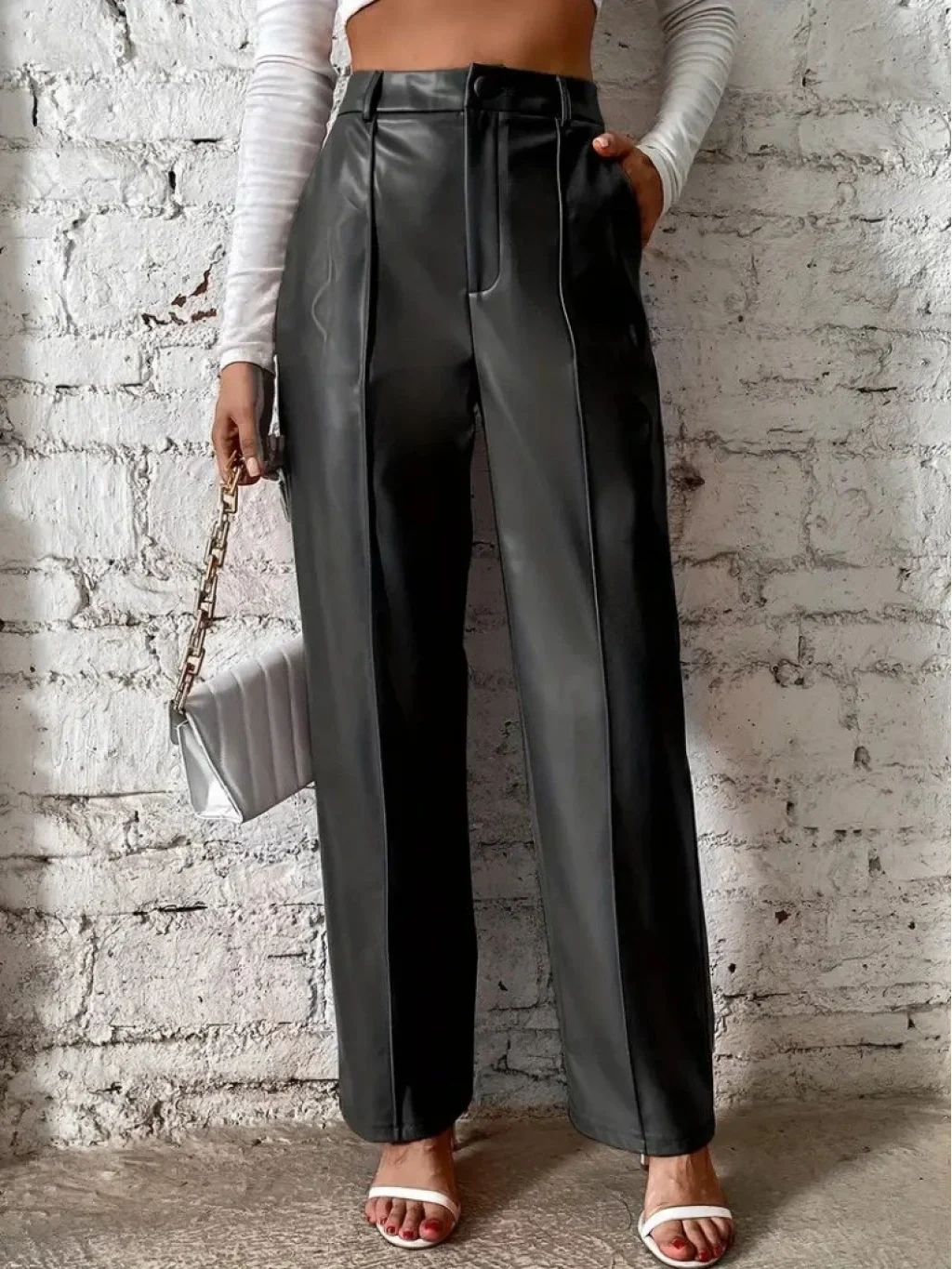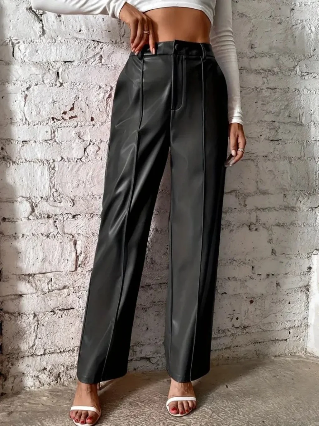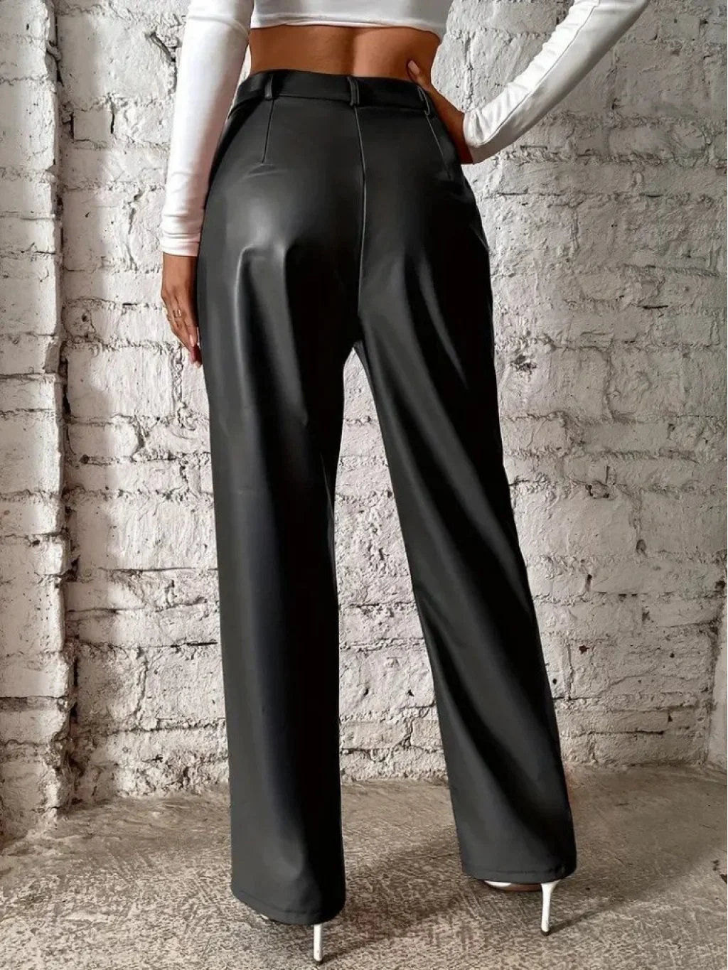 Kadın önden Fermuarlı Cepli Geniş Kesim Lame Deri Pantolon
