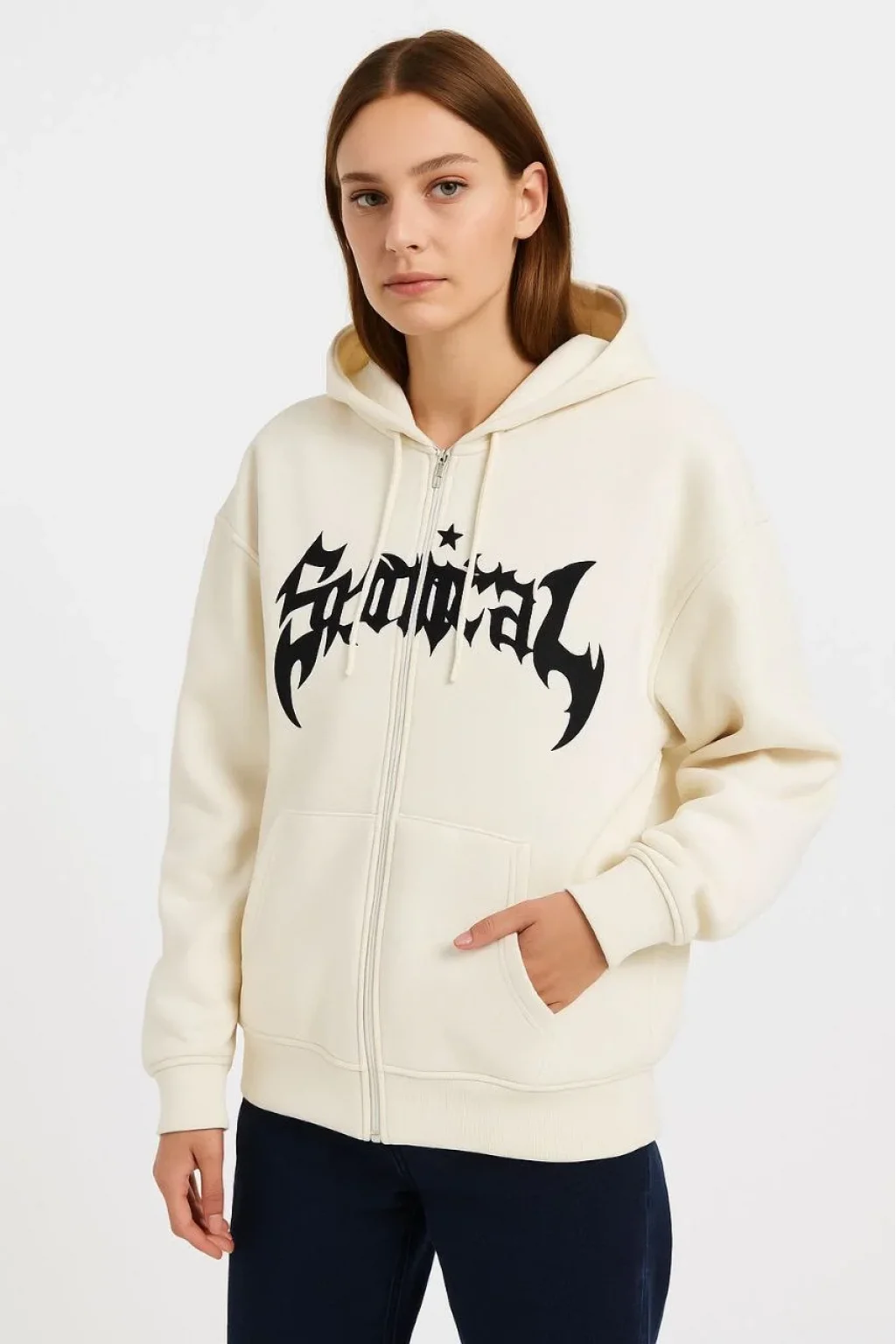 Kadın Kapüşonlu 3 İplik Şardonlu Önü Baskılı Fermuarlı Oversize Sweatshirt - Beyaz