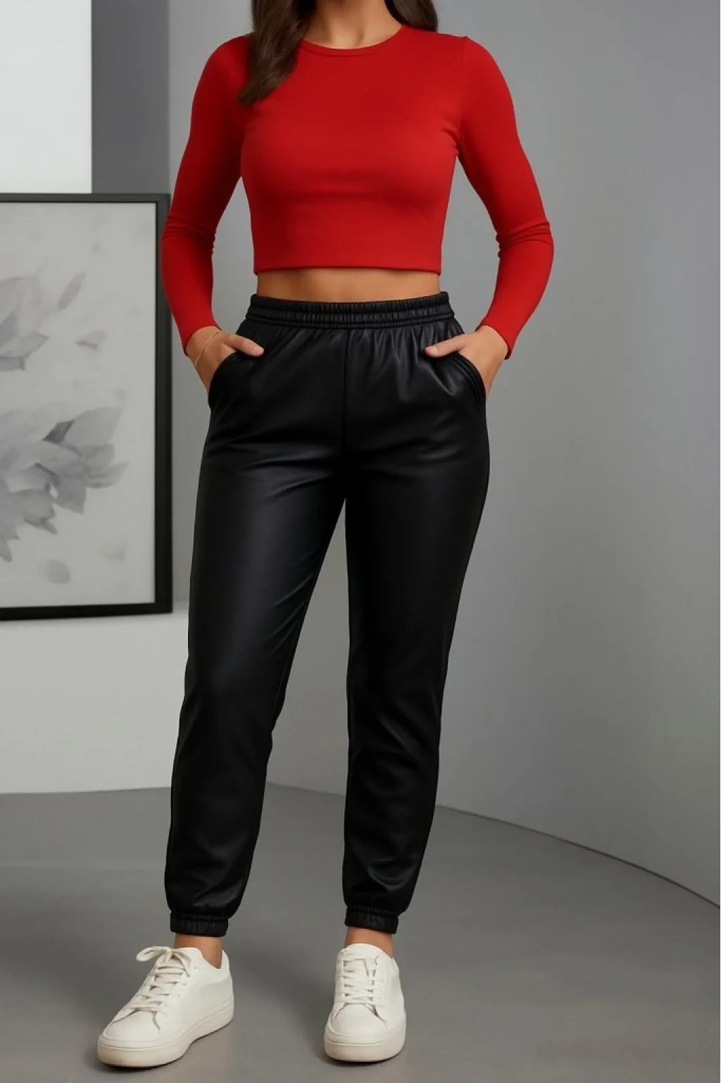 Kadın Paçası Lastikli Cep Detaylı Deri Tayt
