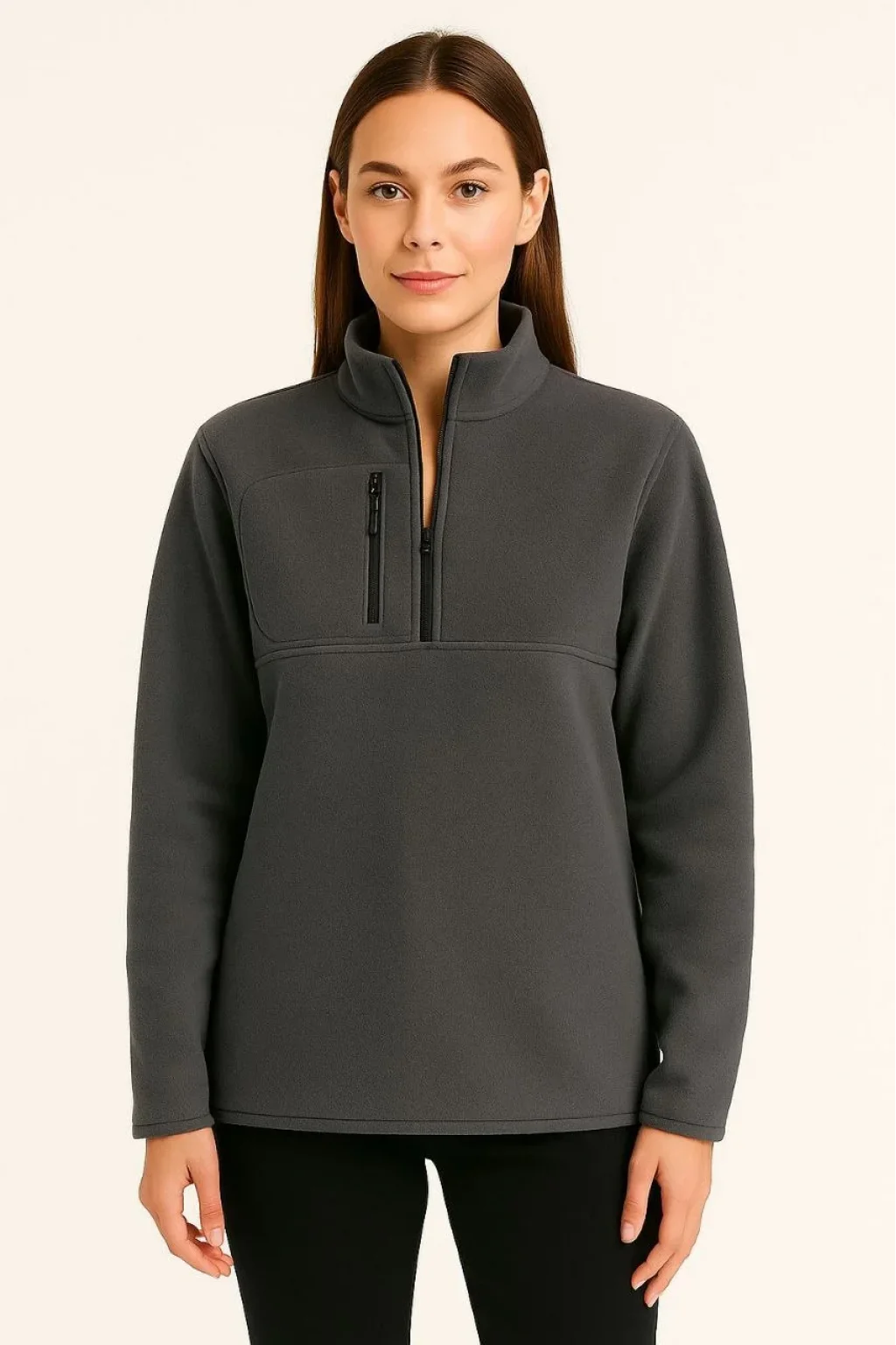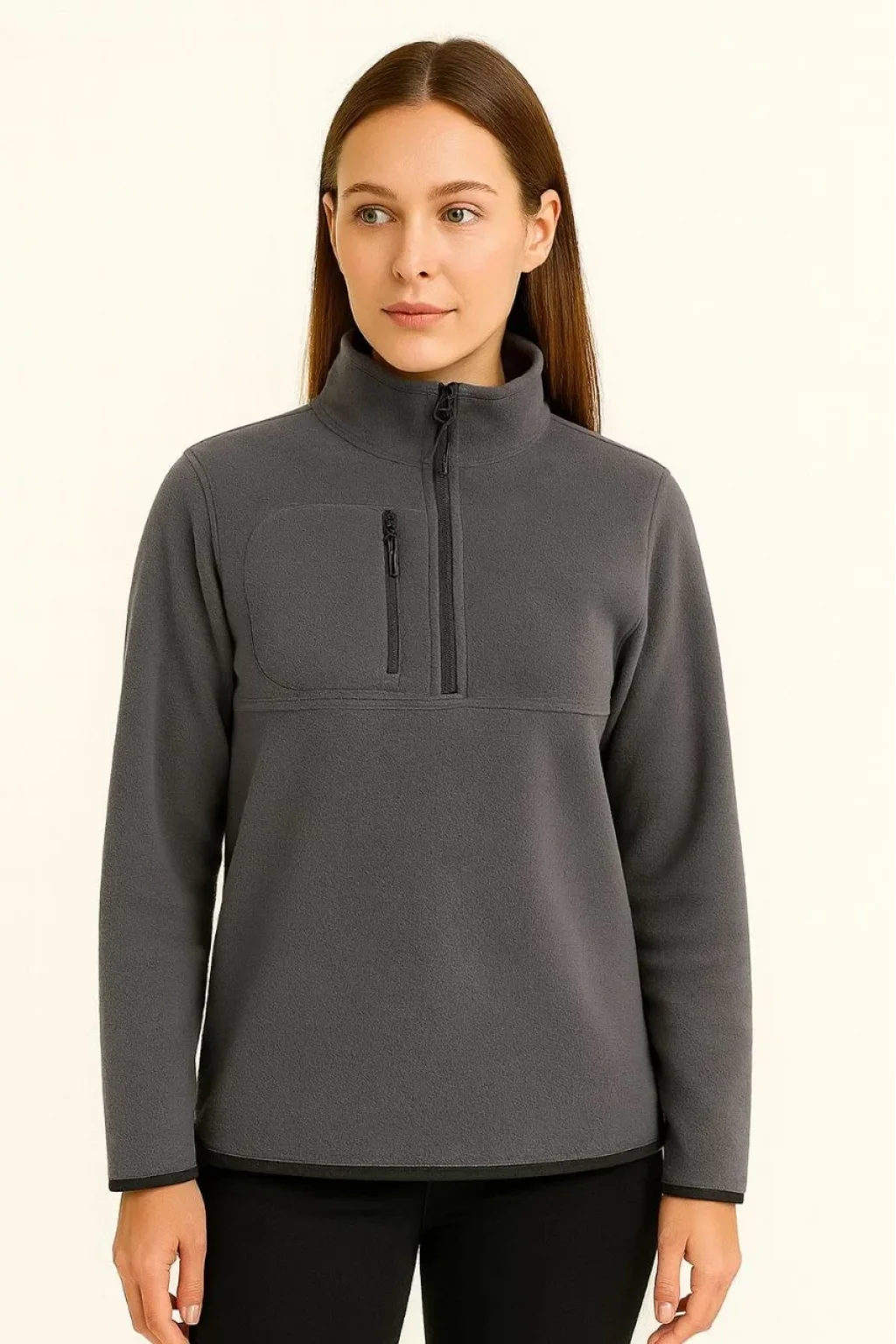 Kadın Polar Kazak – Dik Yaka, Yarım Fermuarlı, Fermuarlı Göğüs Cepli, Siyah Biyeli, Kışlık Rahat Regular Fit Günlük Model - Füme
