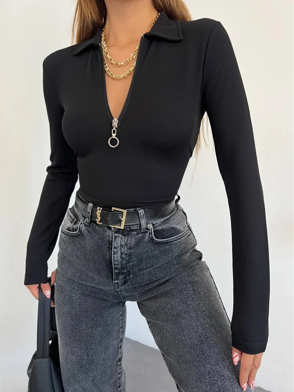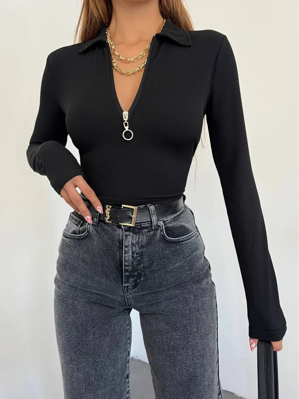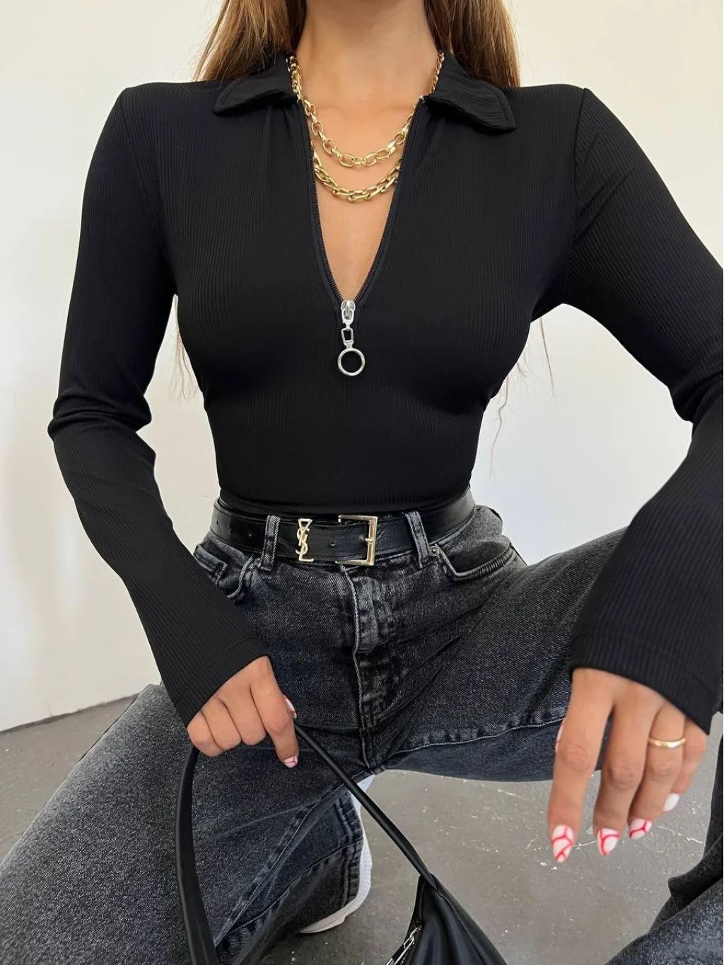 Kadın Polo Yaka Yakası Fermuarlı Burgu Kumaş Bluz