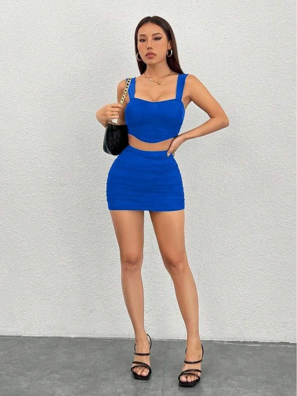 Kadın Sandy Kumaş Kalın Askılı Crop Ve Büzgülü Etek Takım