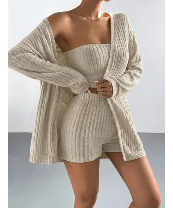 Kadın Sıfır Kol Askılı V Yakalı önden Düğmeli Ithal Keten Ceket Ve Short Ikili Takım