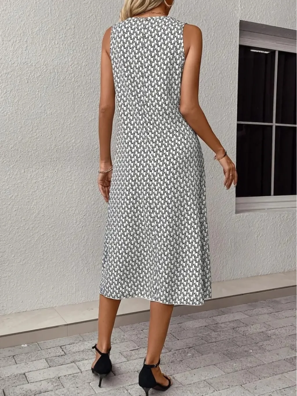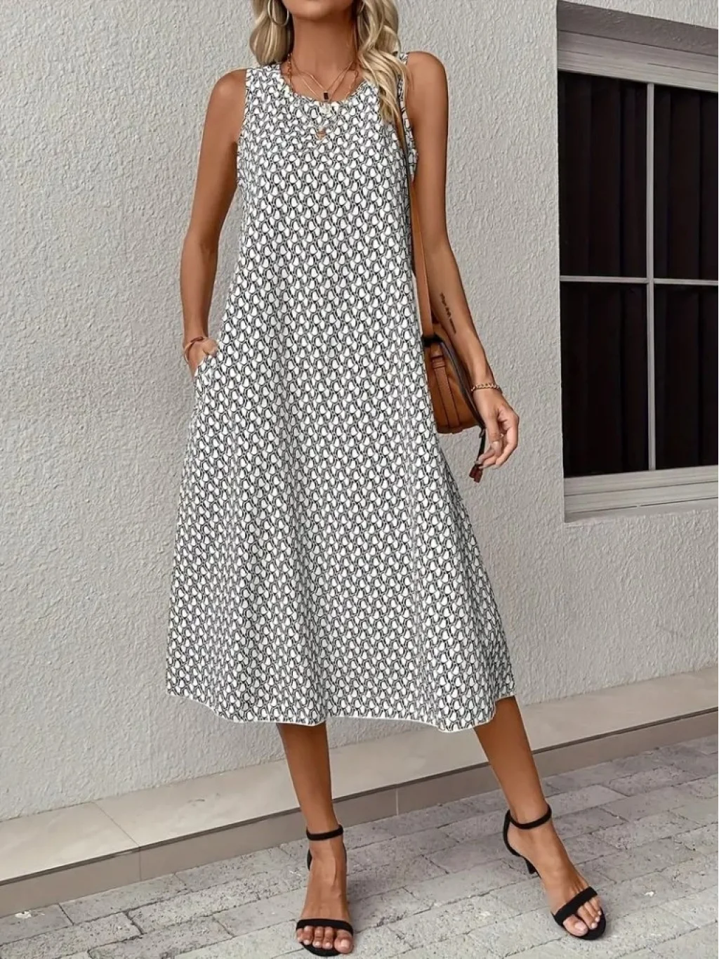 Kadın Sıfır Kol Bisiklet Yaka Desenli Midi Boy Sandy Elbise