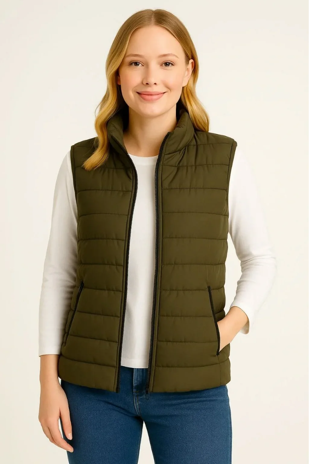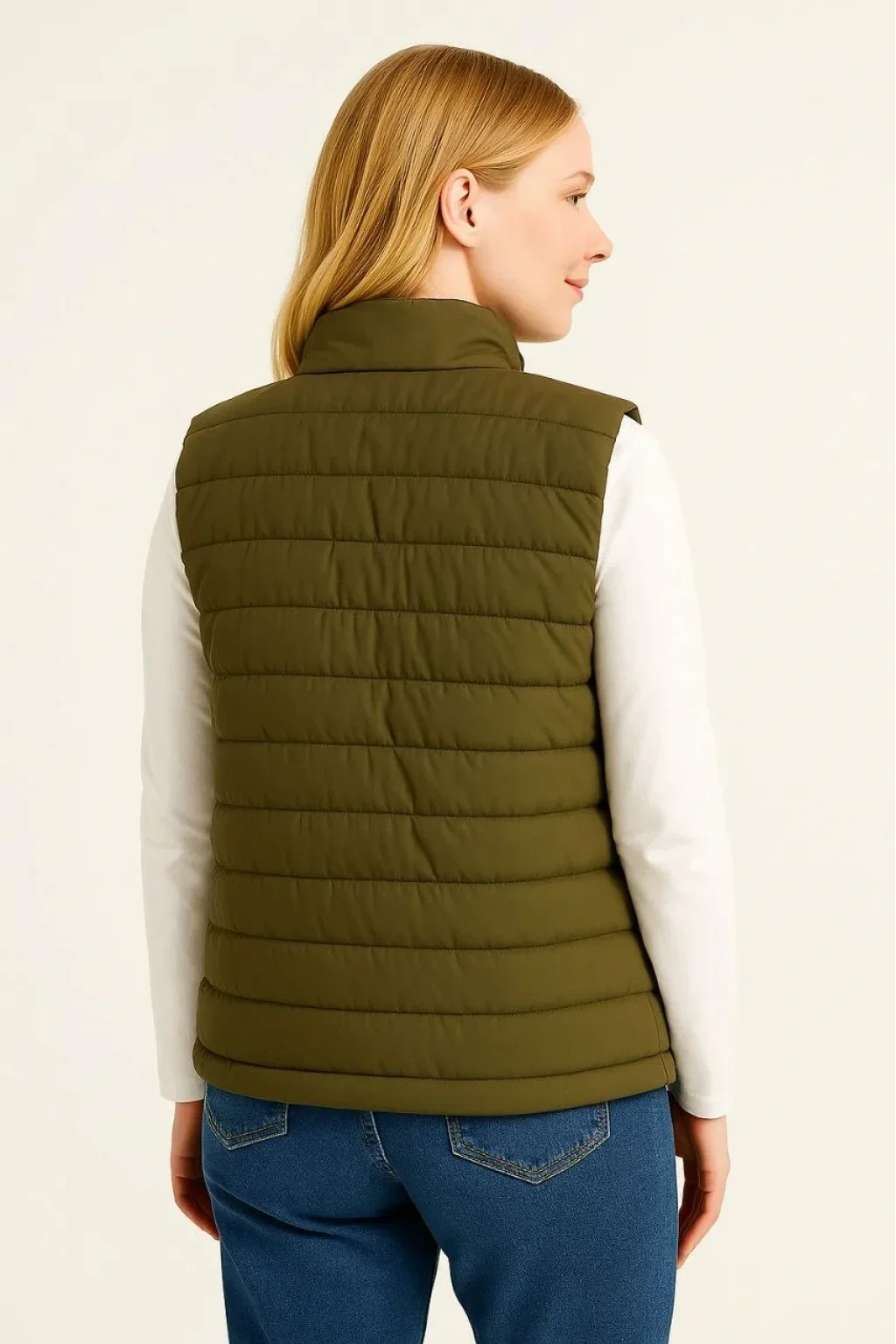 Kadın Şişme Fermuarlı Yelek Su itici Kapitone Astarlı Kumaş Cepli Hafif Kışlık Spor Rahat Kalıp - Haki