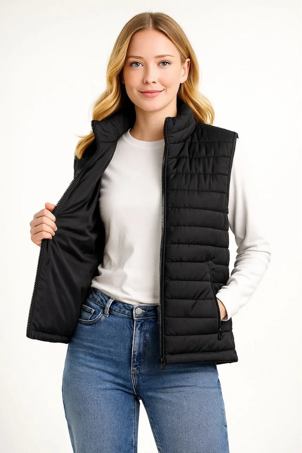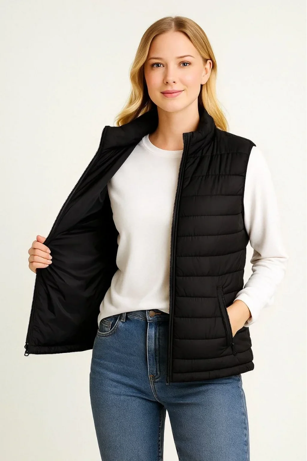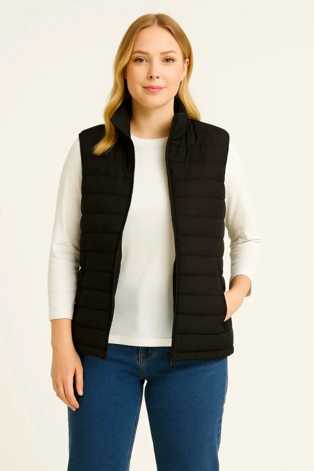 Kadın Şişme Fermuarlı Yelek Su itici Kapitone Astarlı Kumaş Cepli Hafif Kışlık Spor Rahat Kalıp - Siyah