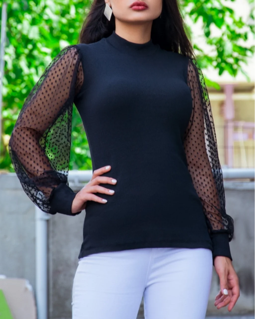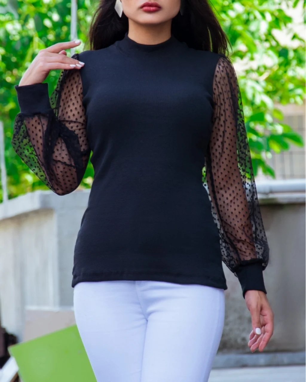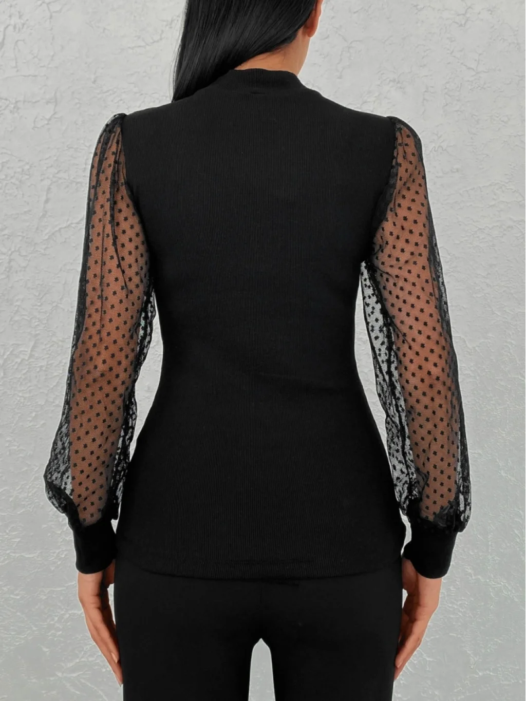 Kadın Siyah Kolu Tül Detaylı Yarım Balıkçı Kaşkorse Bluz 6160
