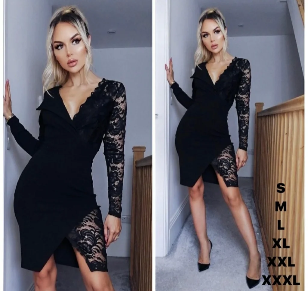 Kadın Siyah Uzun Kollu Tek Kolu Dantel Detay V Yakalı Yırtmaçlı Dalgıç Elbise