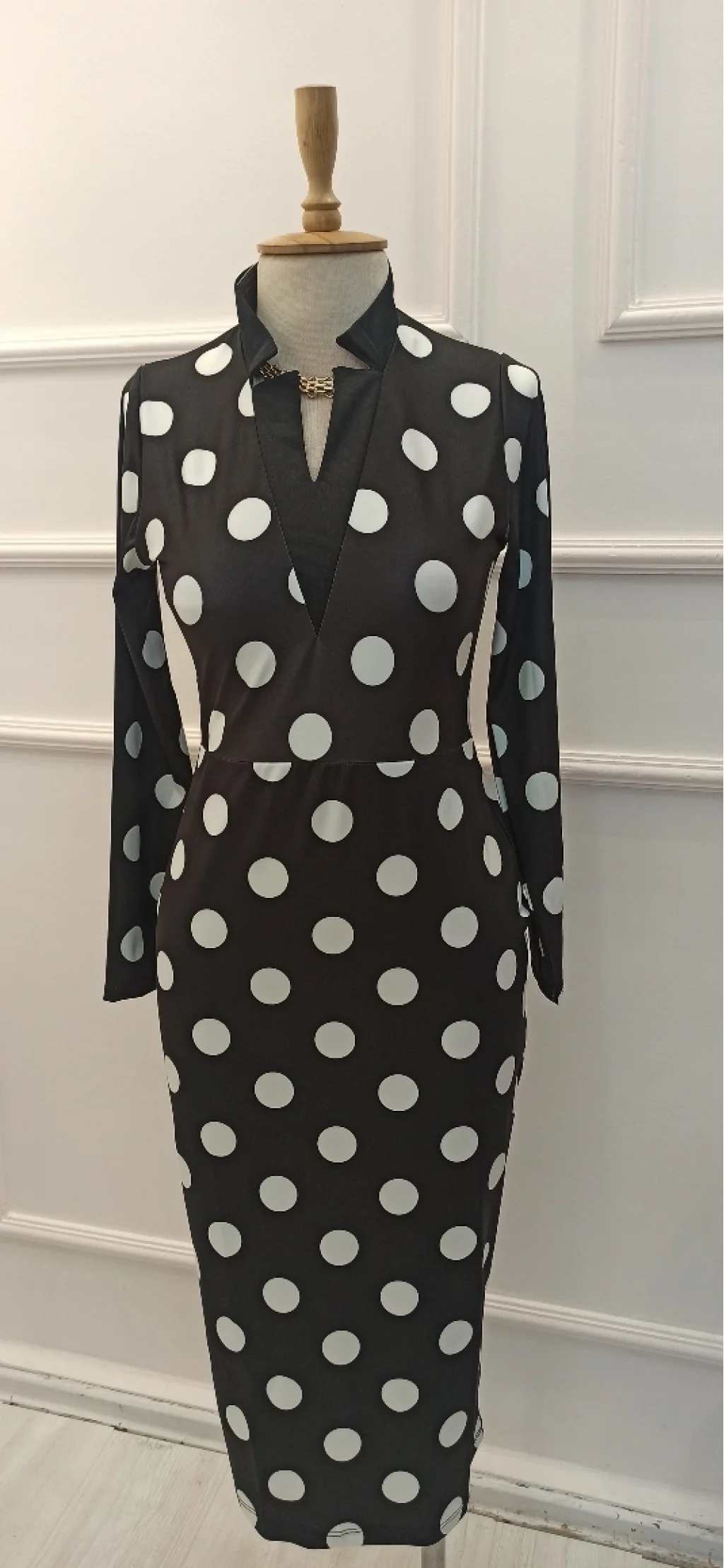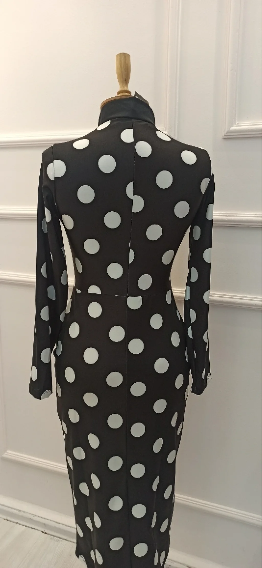 Kadın Siyah Uzun Kollu V Yakalı Puantiyeli Midi Dalgıç Elbise