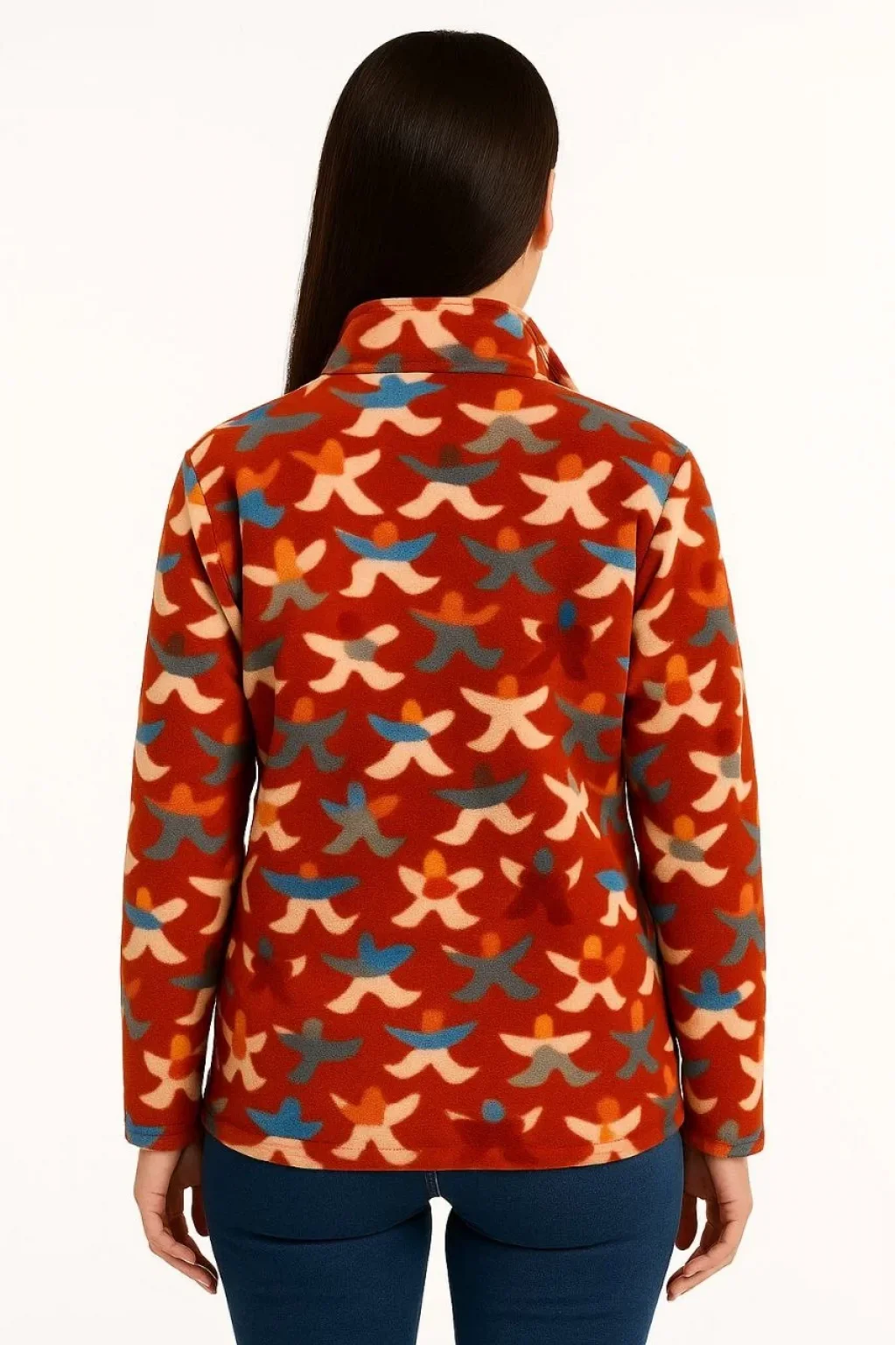 Kadın Tam Fermuarlı Desenli Polar Sweat – Siyah Multicolor Figür Desen Yakalı, Uzun Kollu, Oversize Rahat Kalıp - Kiremit