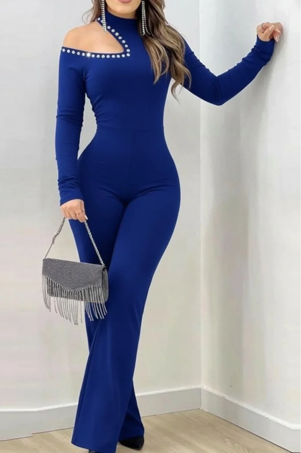 Kadın Tek Omuzdan Açık Balıkçı Yaka Taş Detaylı Uzun Ithal Krep Tulum