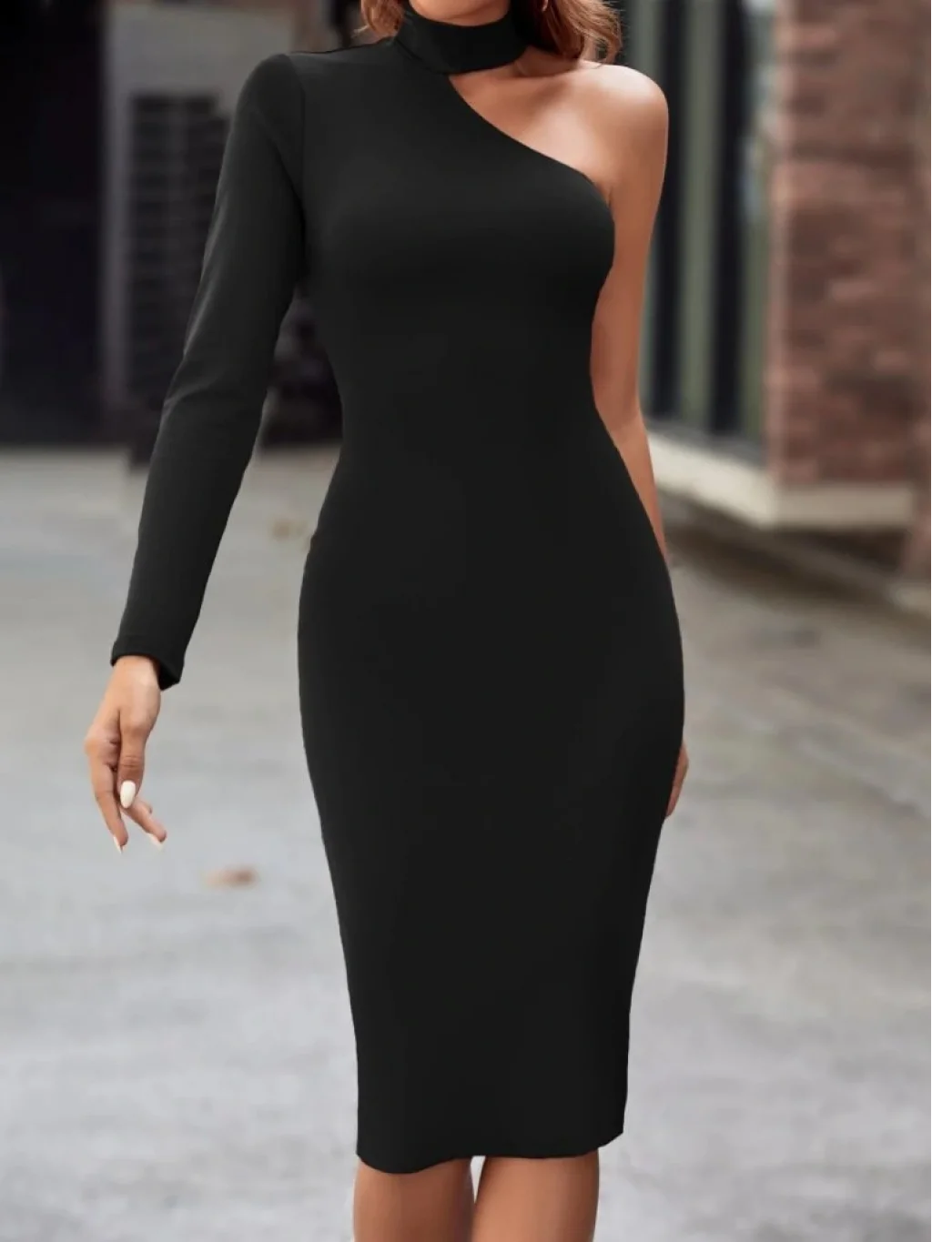 Kadın Tek Omuzdan Açık Uzun Kollu Balıkçı Yaka Midi Ithal Krep Elbise