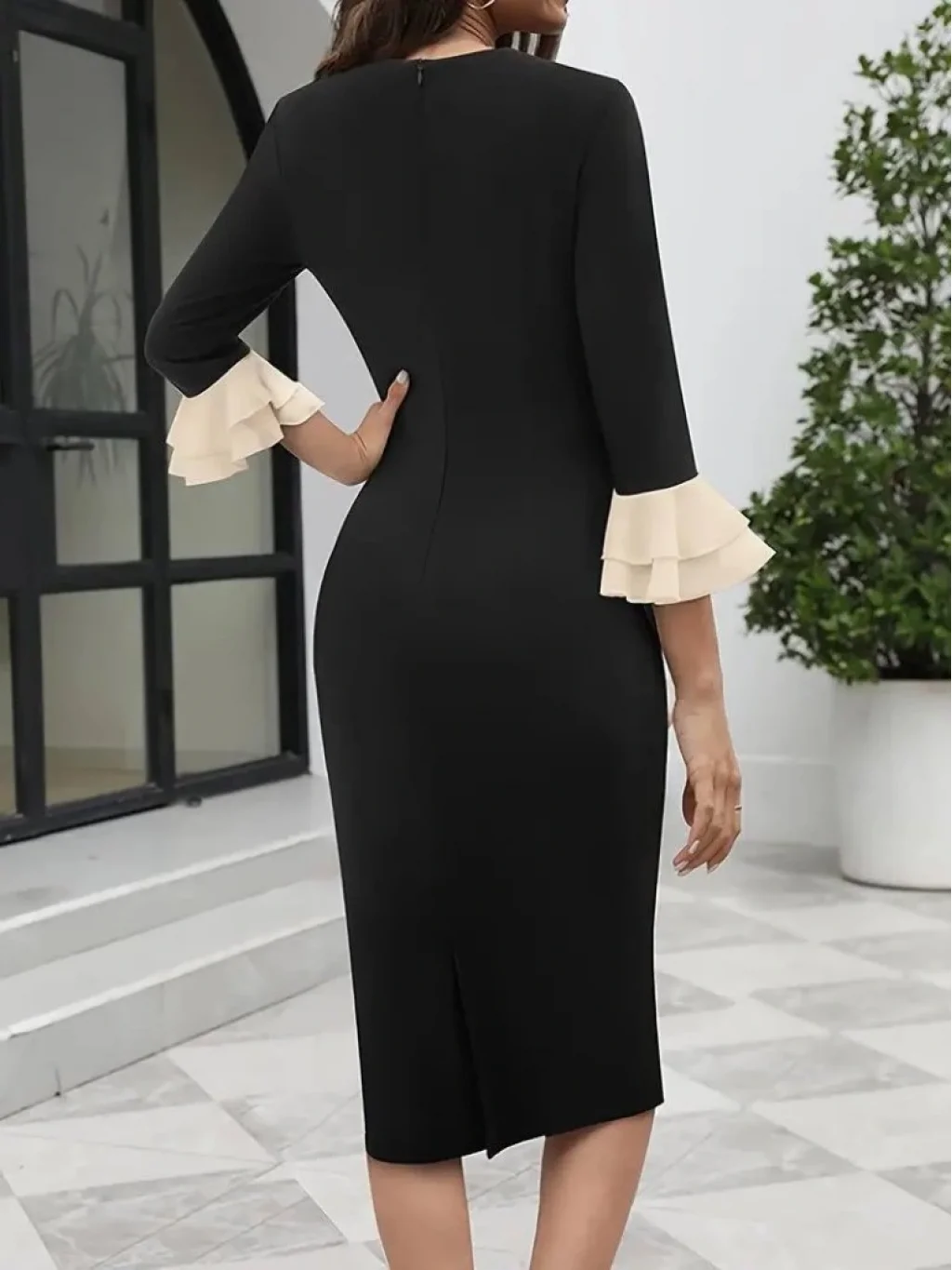 Kadın Truvakar Kollu Fiyonk Yakalı Midi Ithal Krep Elbise