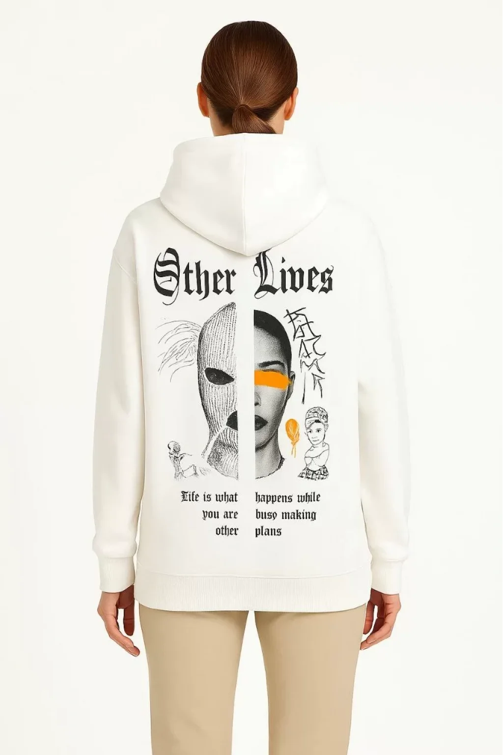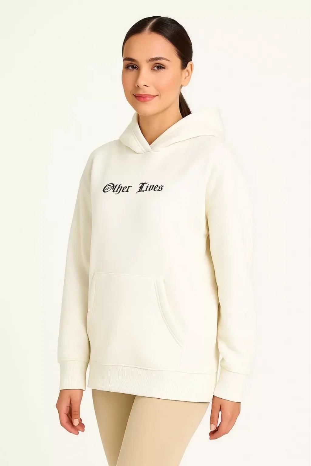 Kadın Kapşonlu Sweatshirt – Oversize Üç İplik Şardonlu Hoodie, “Other Lives” Ön & Arka Baskılı, Kanguru Cepli, Kışlık Rahat Günlük Stil - Beyaz