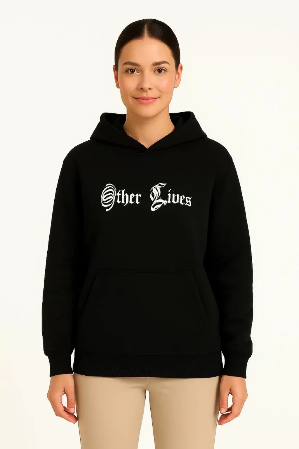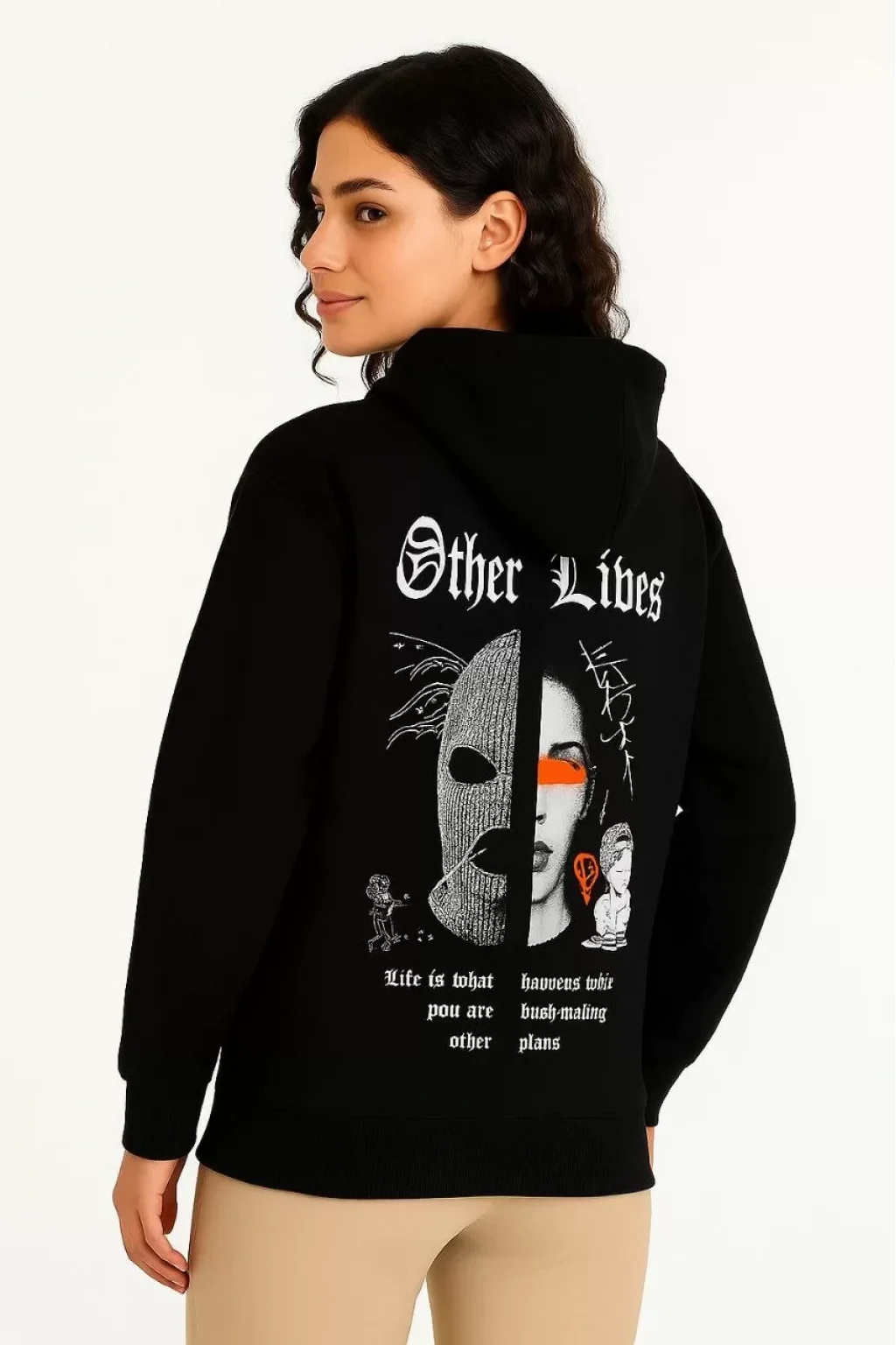 Kadın Kapşonlu Sweatshirt – Oversize Üç İplik Şardonlu Hoodie, “Other Lives” Ön & Arka Baskılı, Kanguru Cepli, Kışlık Rahat Günlük Stil- Siyah