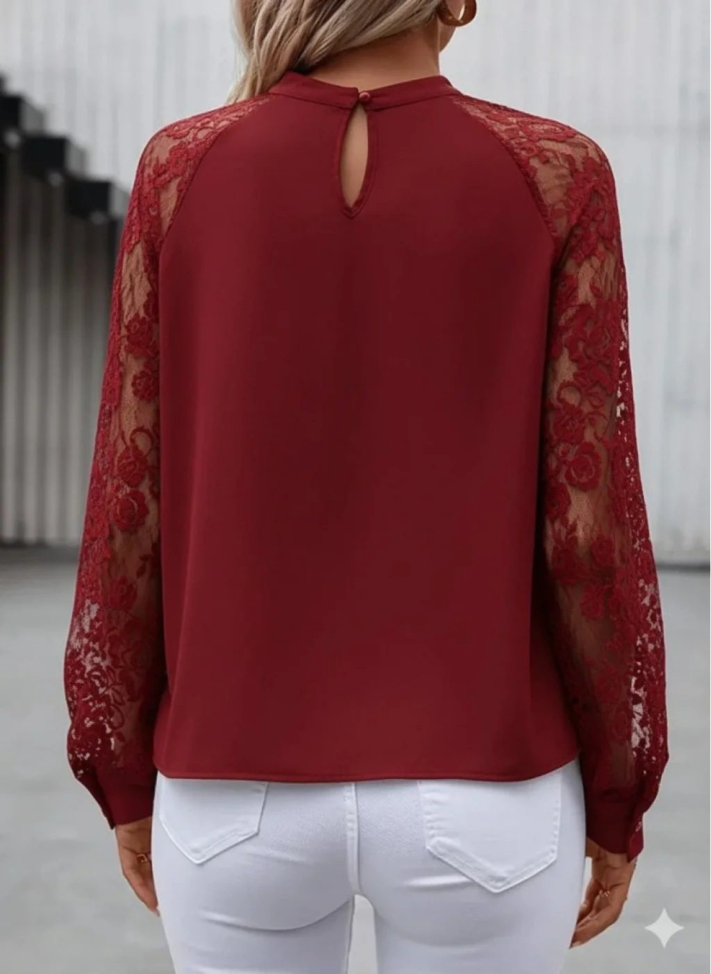 Kadın Uzun Dantel Kollu Yuvarlak Yakalı Sandy Bluz