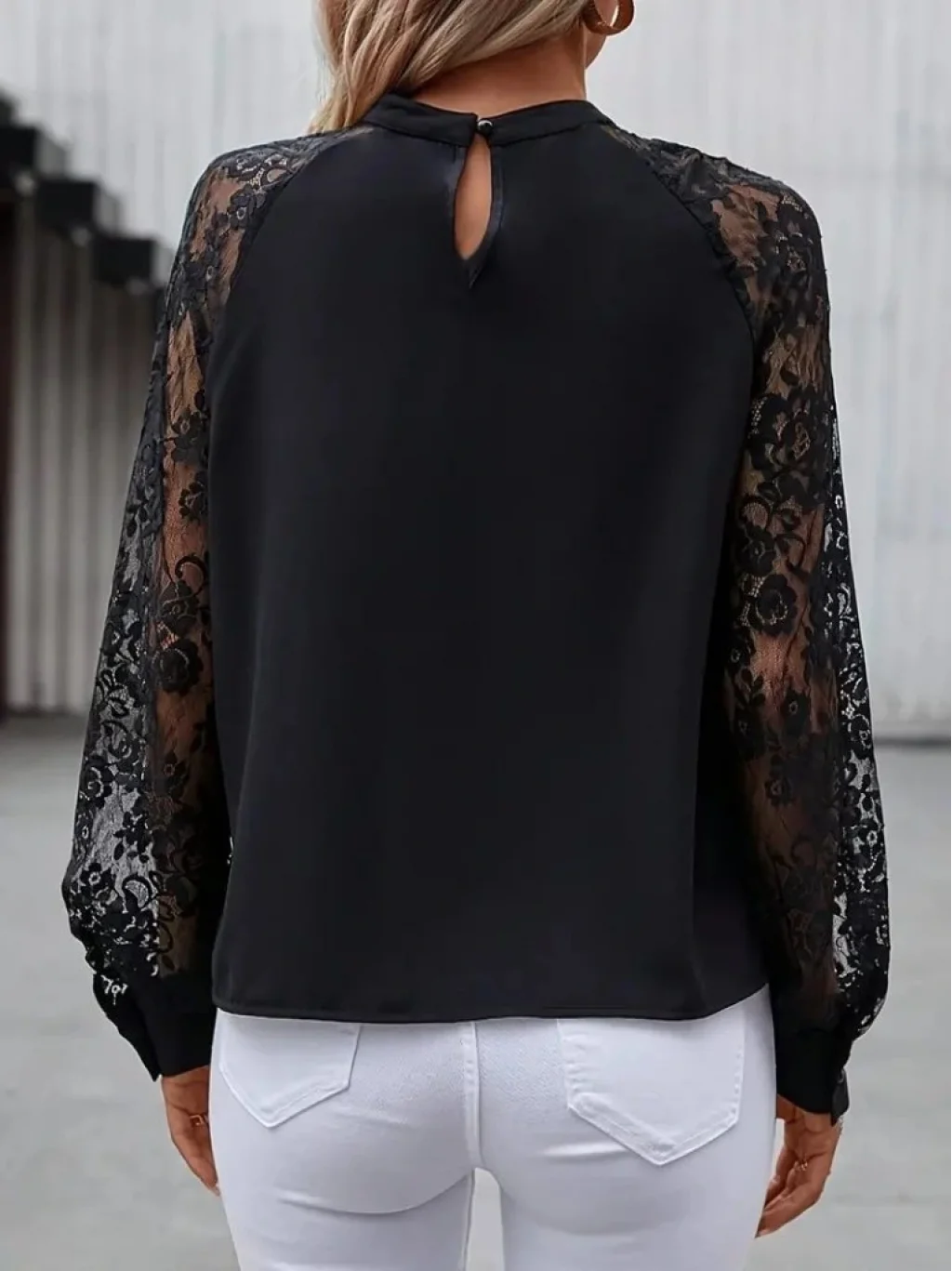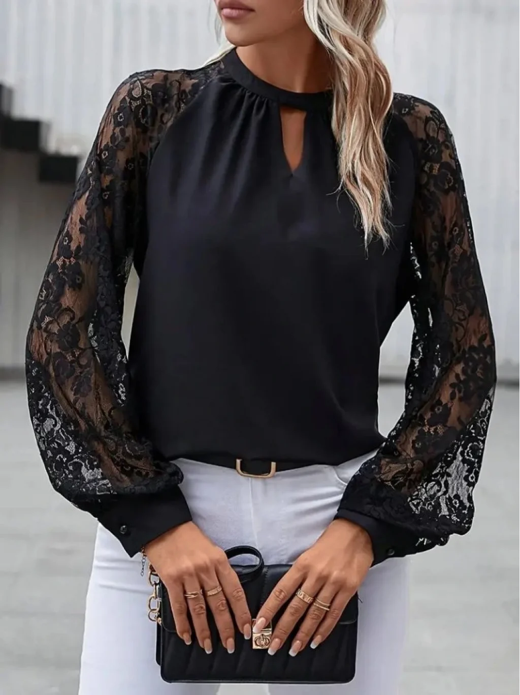 Kadın Uzun Dantel Kollu Yuvarlak Yakalı Sandy Bluz