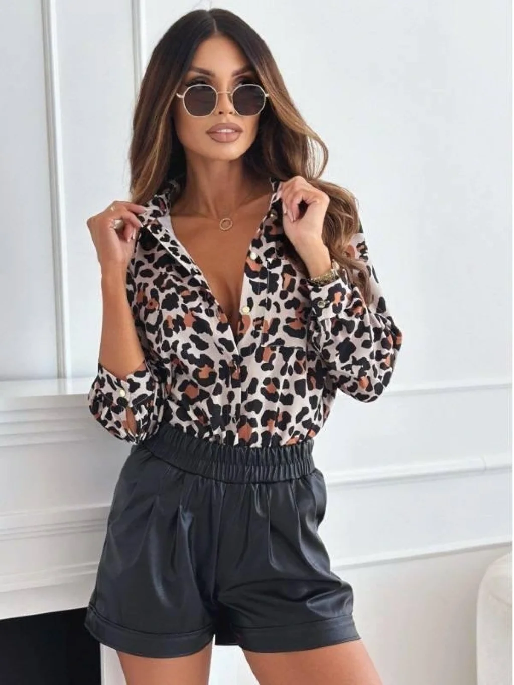 Kadın Uzun Kol Cep Detay Leopar Baskılı Mosskrep Kumaş Gömlek