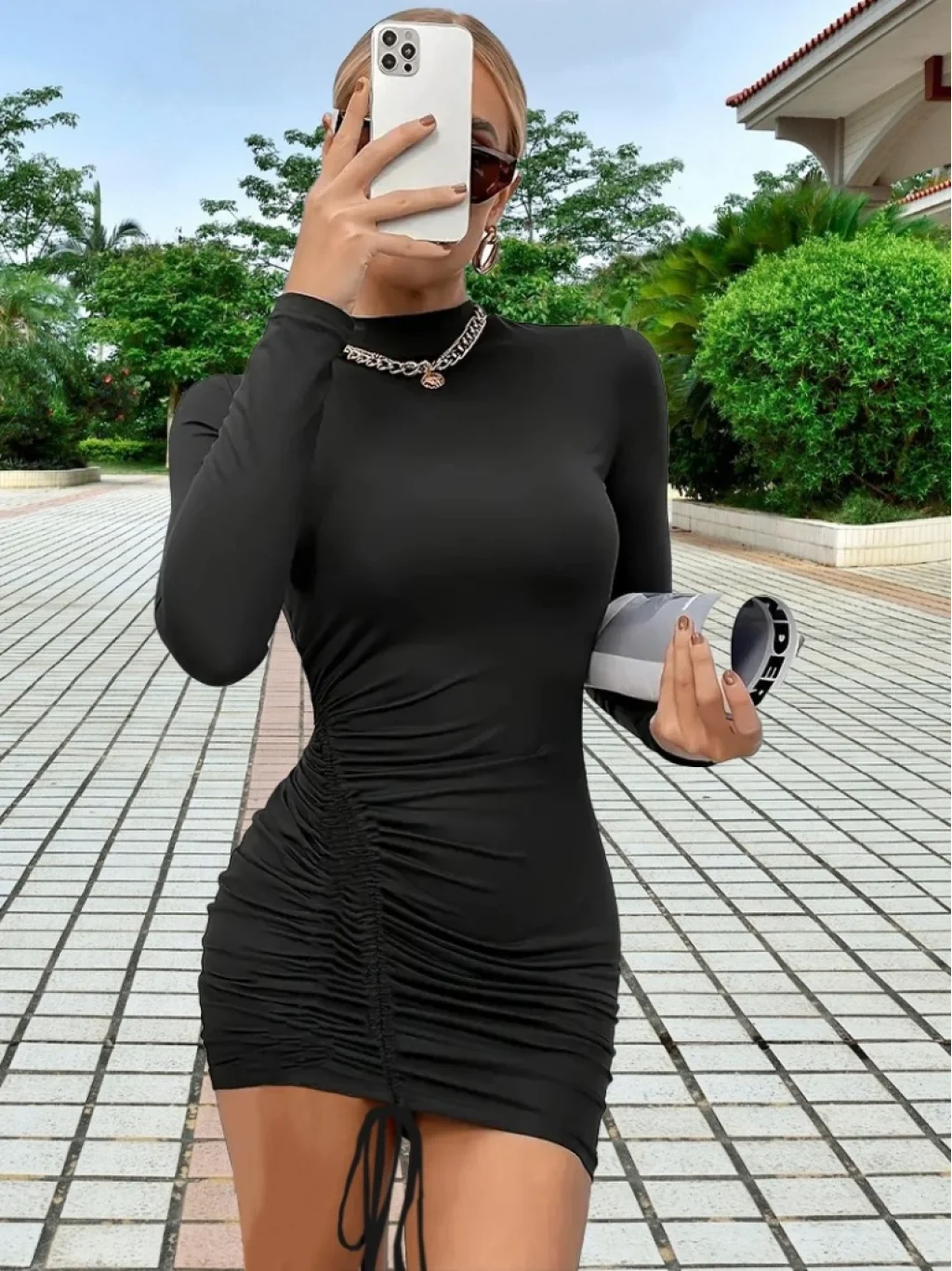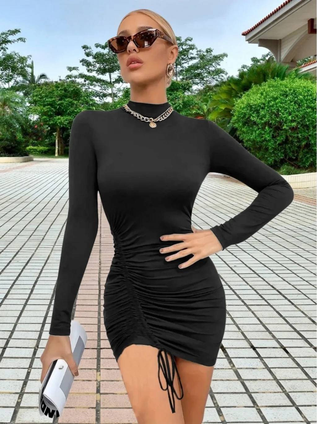 Kadın Uzun Kol Sağ Belden Sol Etek Ucuna Doğru Hafif çapraz Büzgülü Sandy Mini Boy Elbise