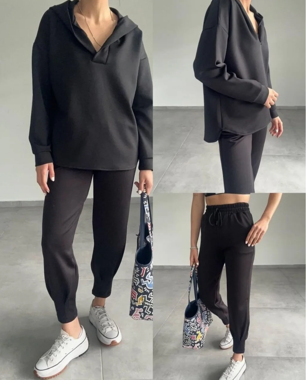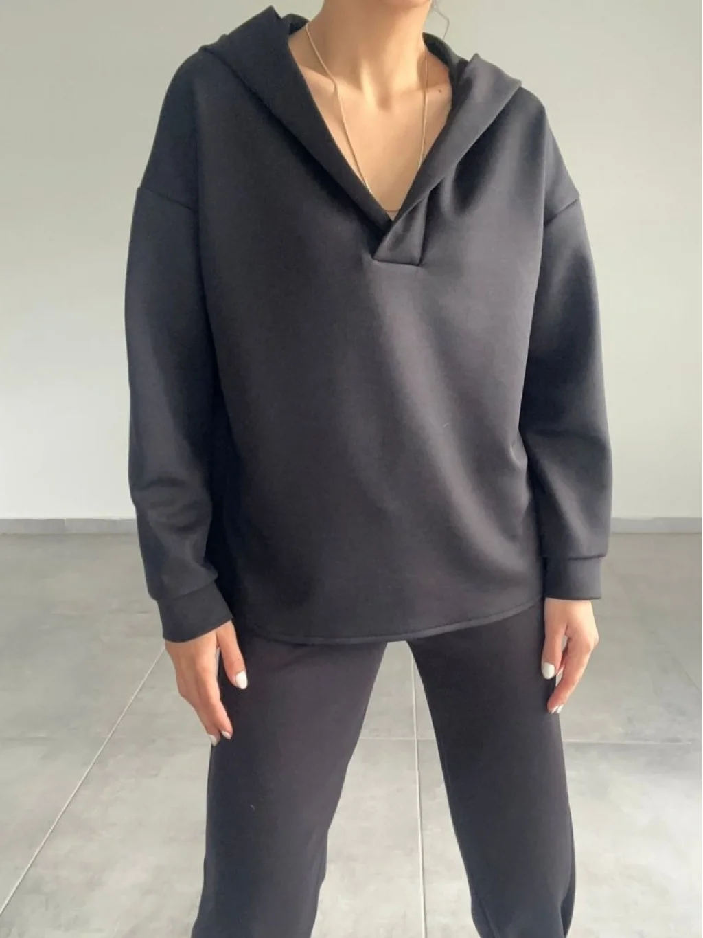 Kadın Uzun Kol V Yaka Kapüşon Detay Sweat Ve Yüksel Bel Eşofman Ikili Takım