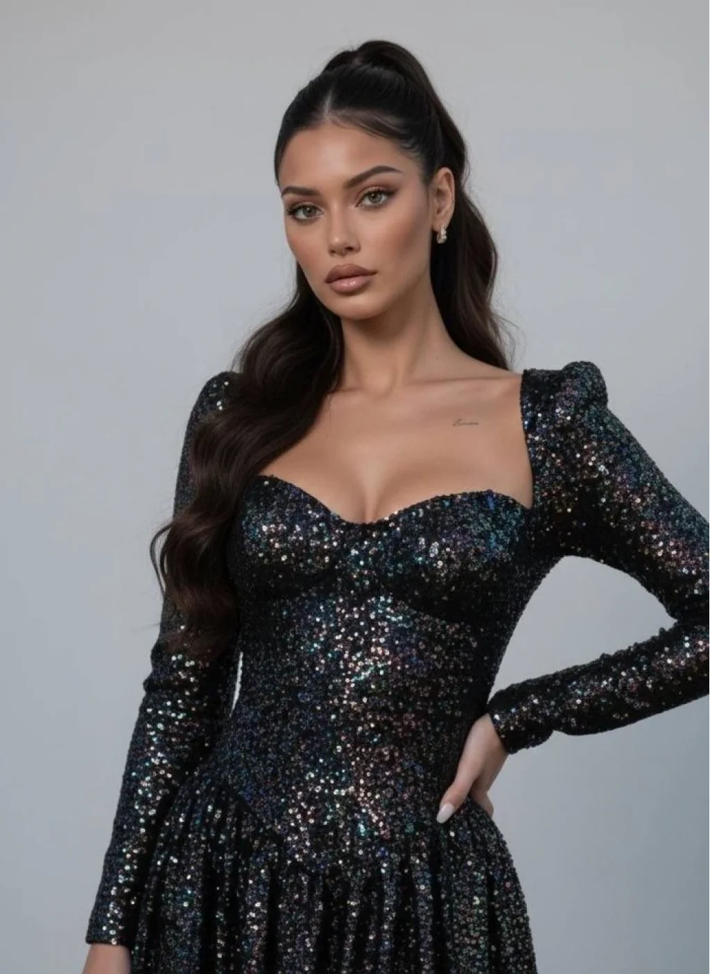 Kadın Uzun Kollu Armut Yaka Pul Payet Işlemeli Mini Gece Elbisesi