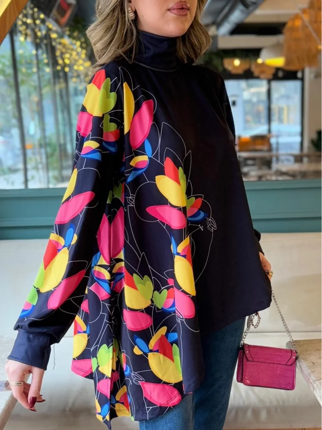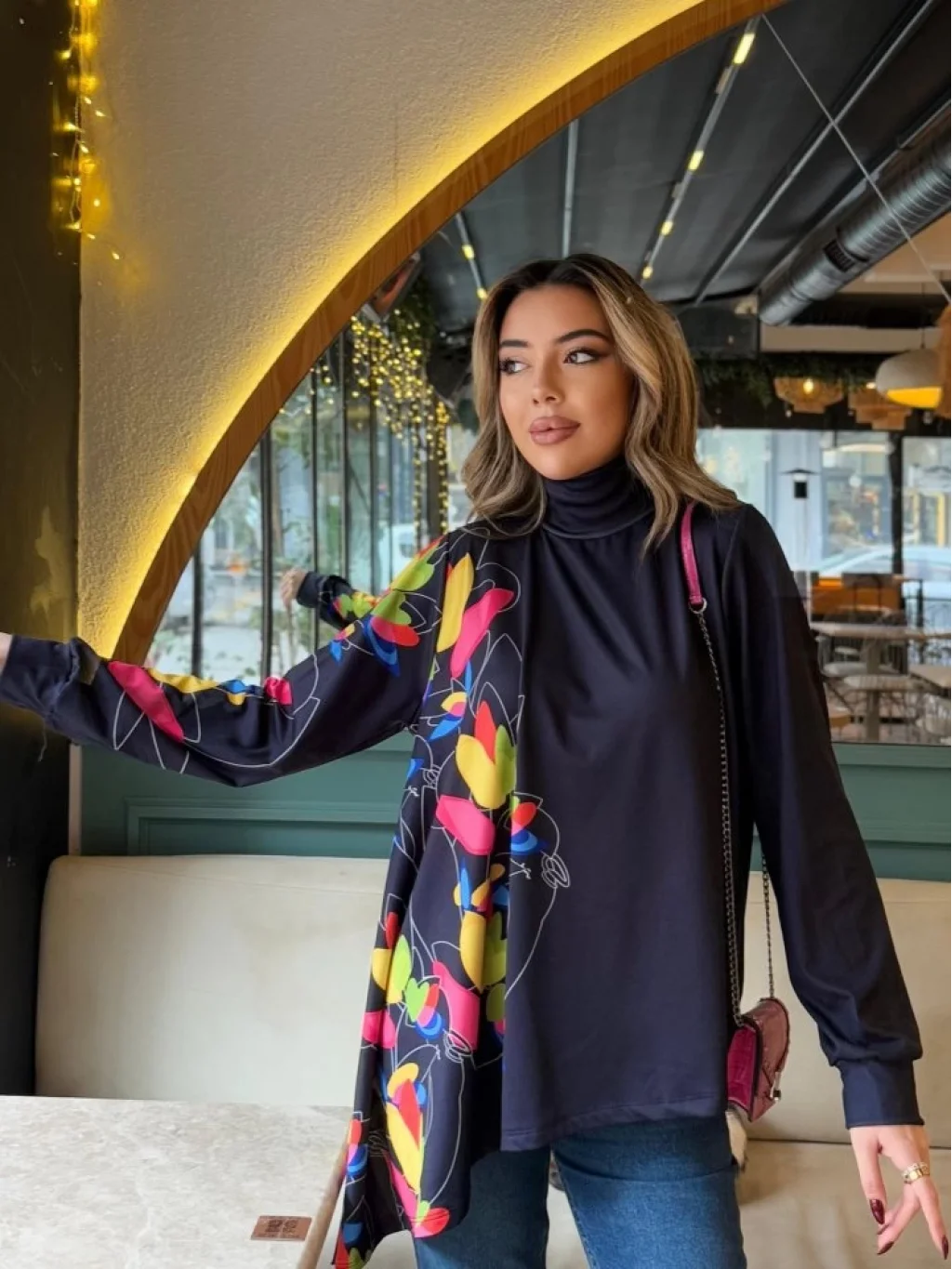 Kadın Uzun Kollu Balıkçı Yaka Asimetrik Kesim Dalgıç Kumaş Bluz