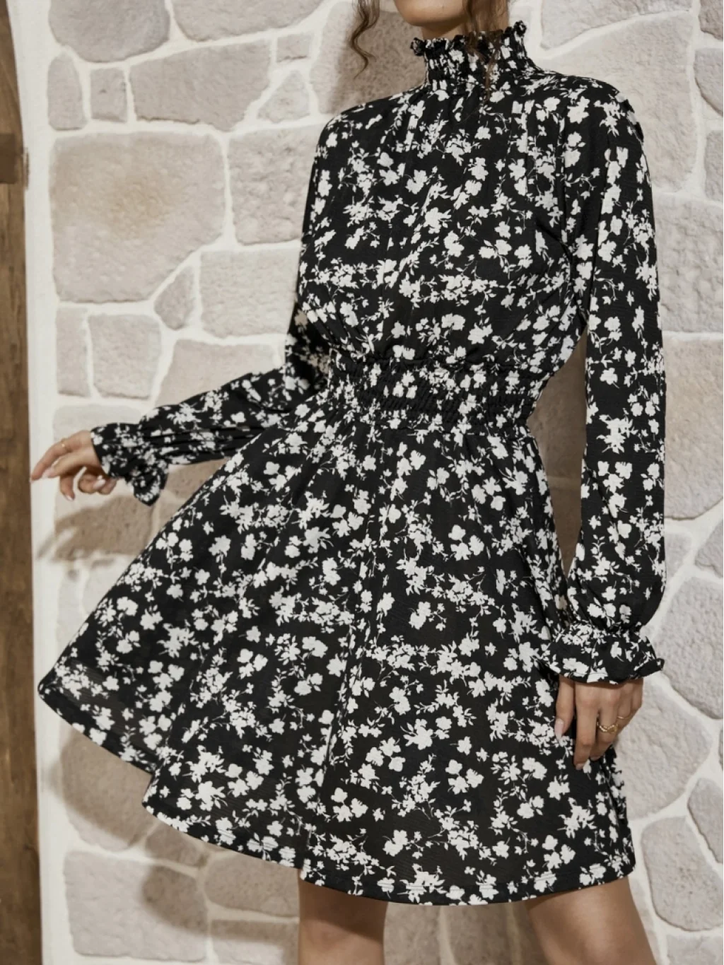Kadın Uzun Kollu Balıkçı Yaka çiçek Baskılı Helen Kumaş Elbise