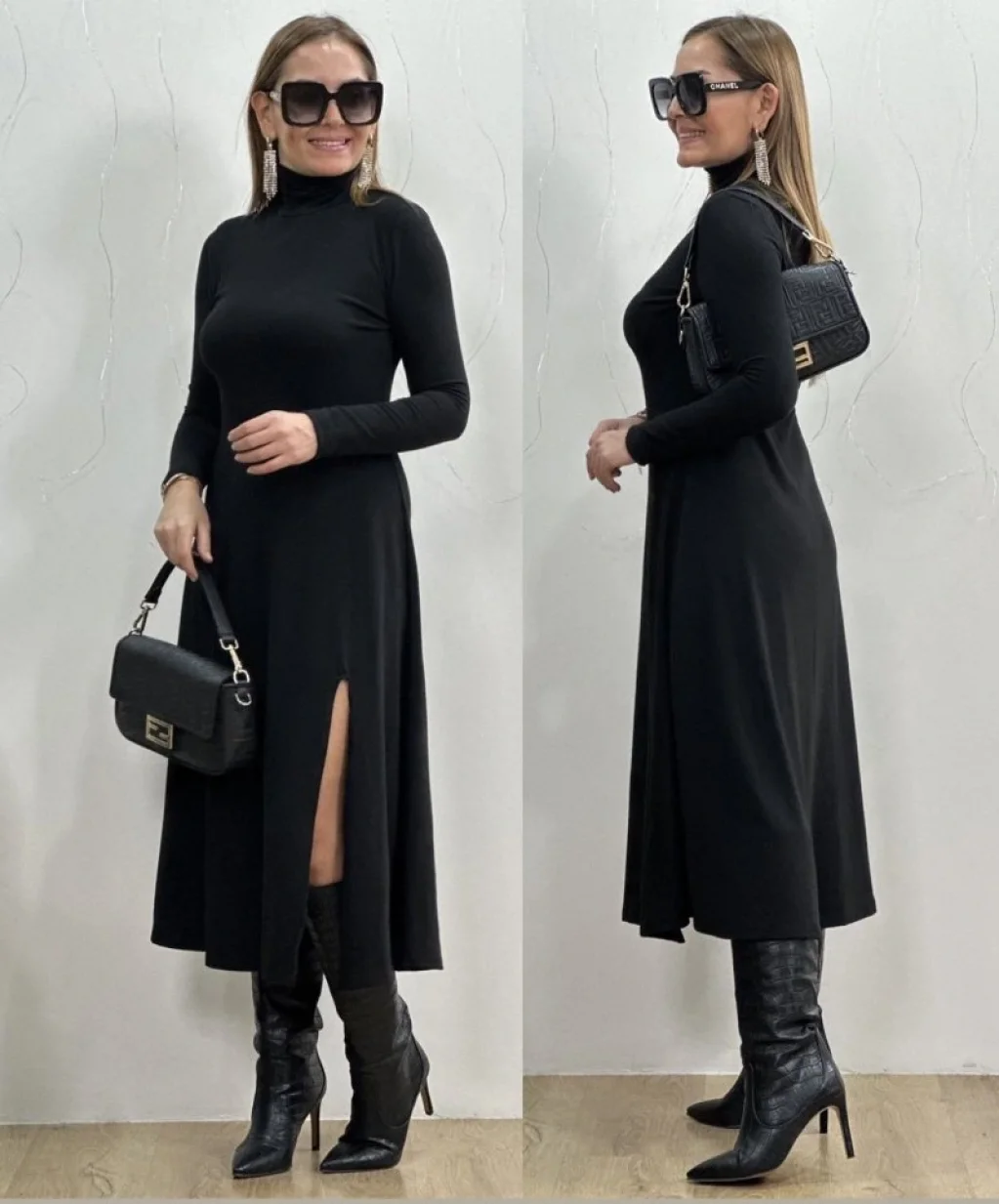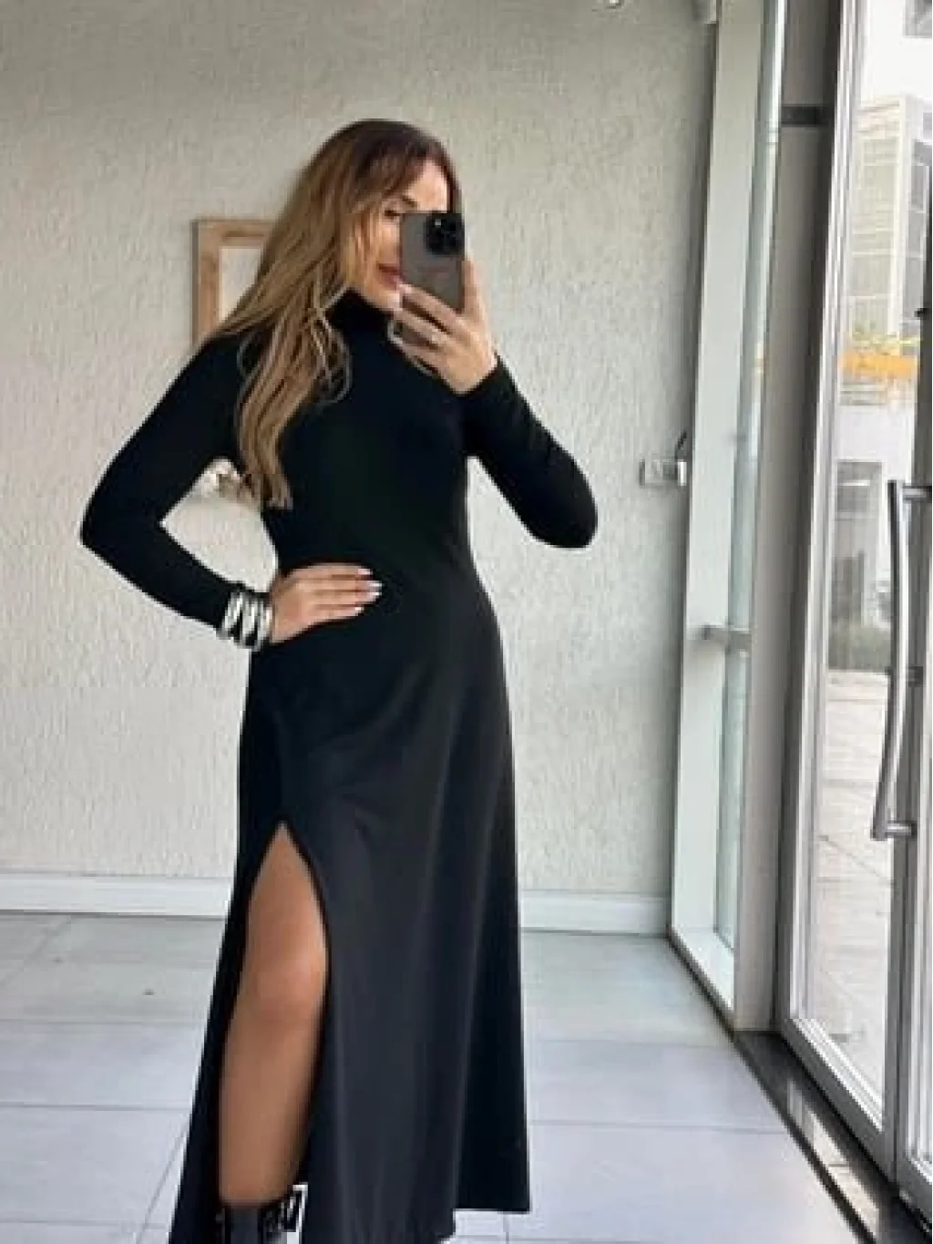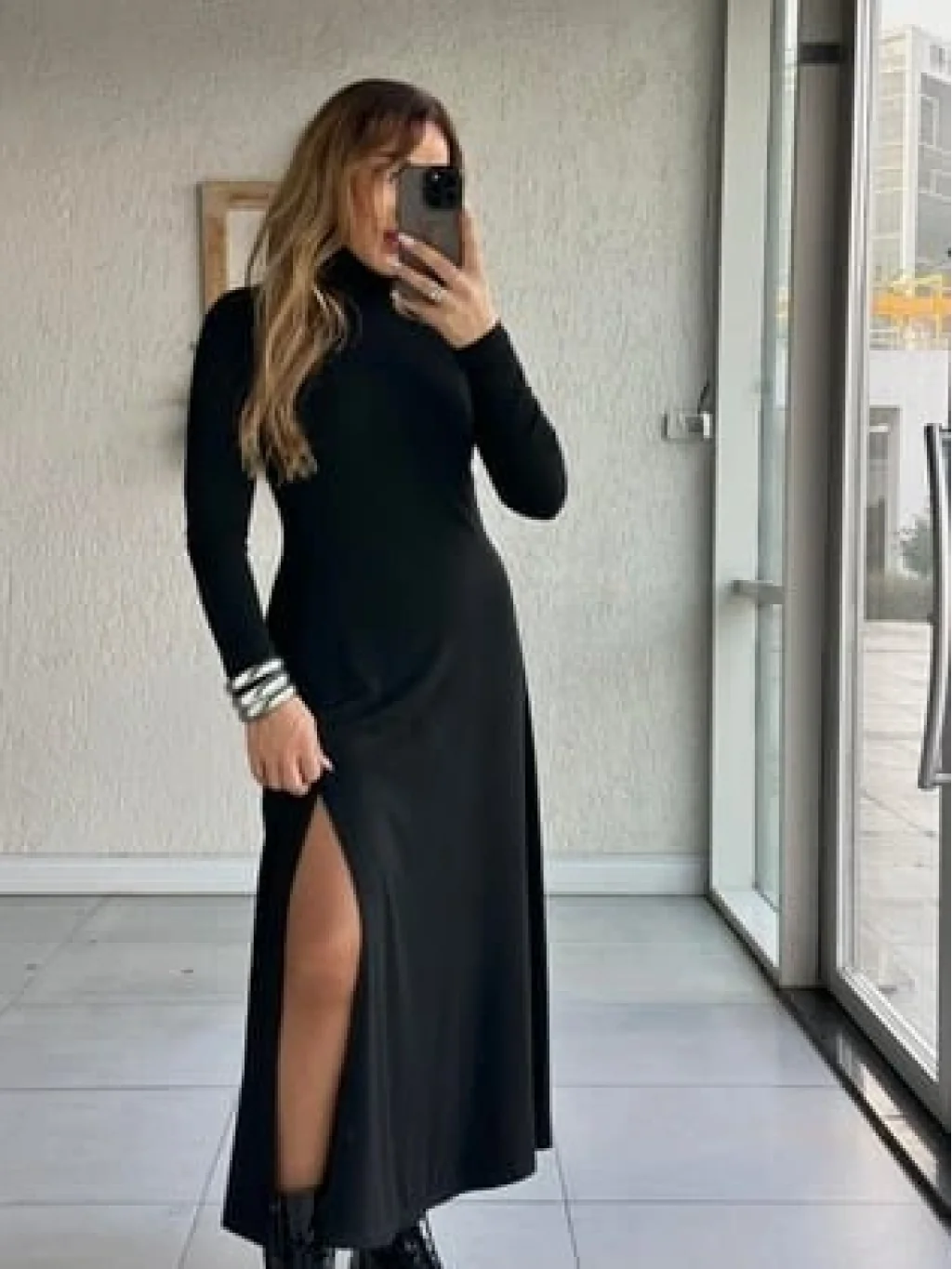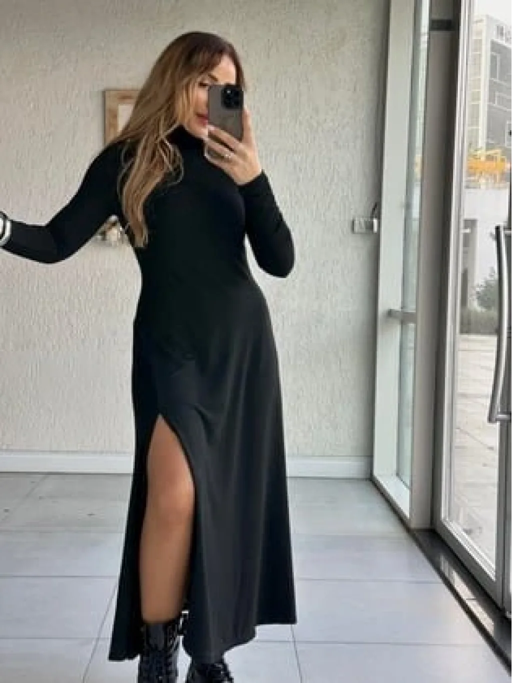 Kadın Uzun Kollu Balıkçı Yaka Derin Yırtmaç Detay Krep Elbise 120 Cm