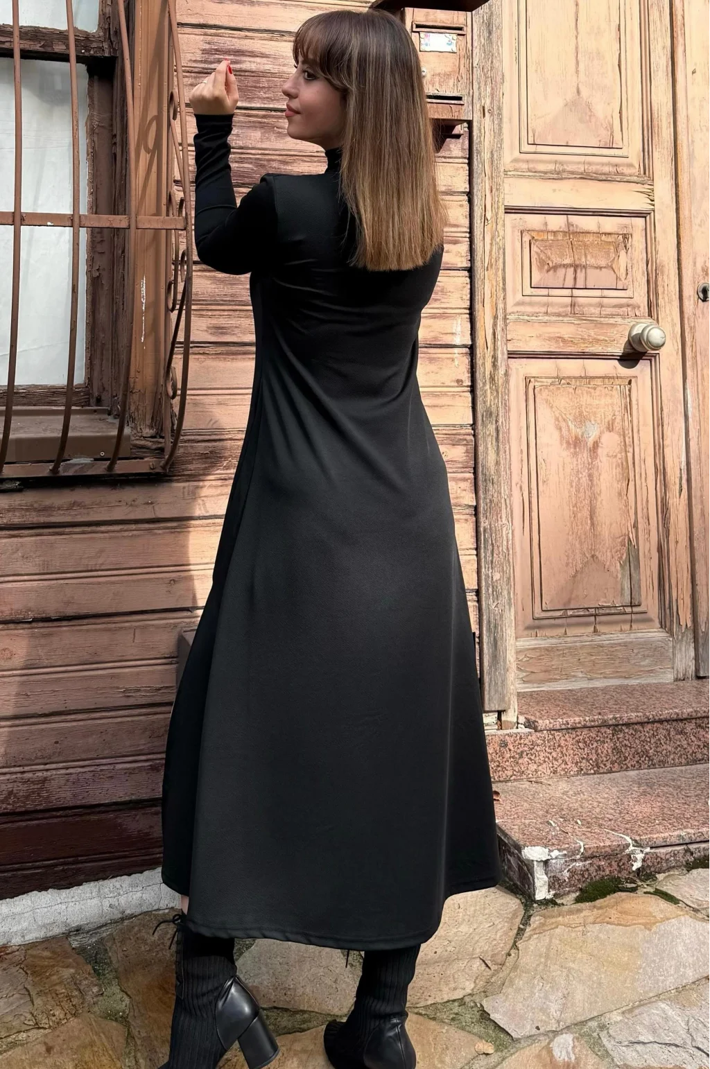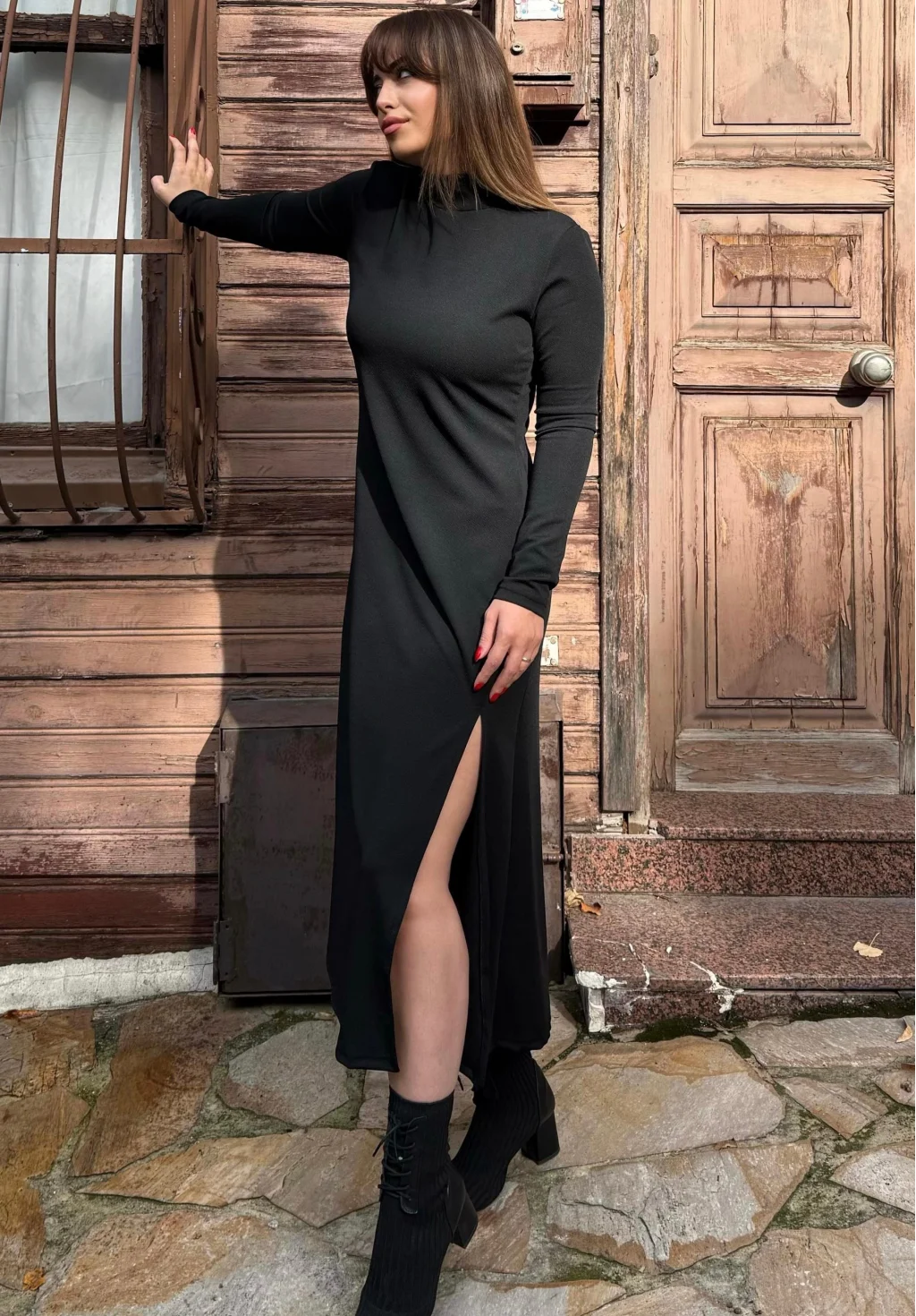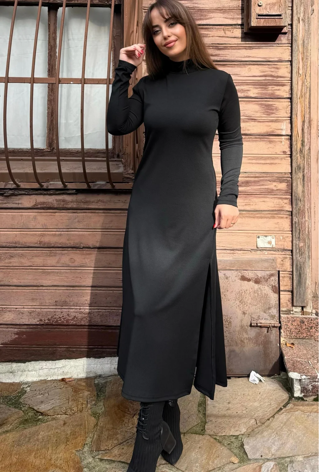 Kadın Uzun Kollu Balıkçı Yaka Derin Yırtmaç Detay Krep Elbise