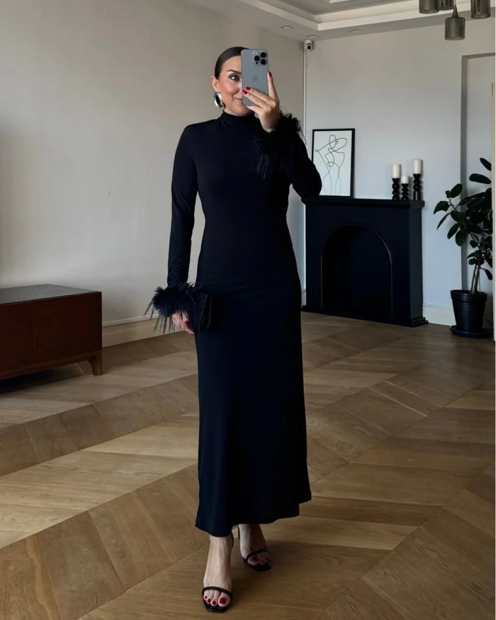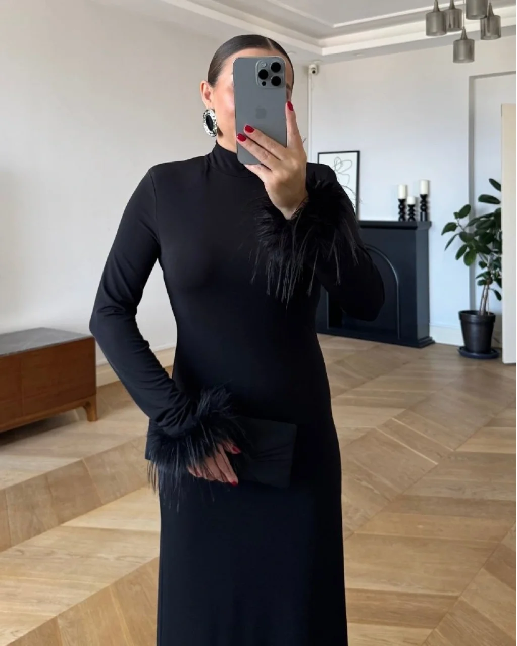Kadın Uzun Kollu Balıkçı Yaka Kol Ağzı Tüy Detaylı Uzun Krep Elbise