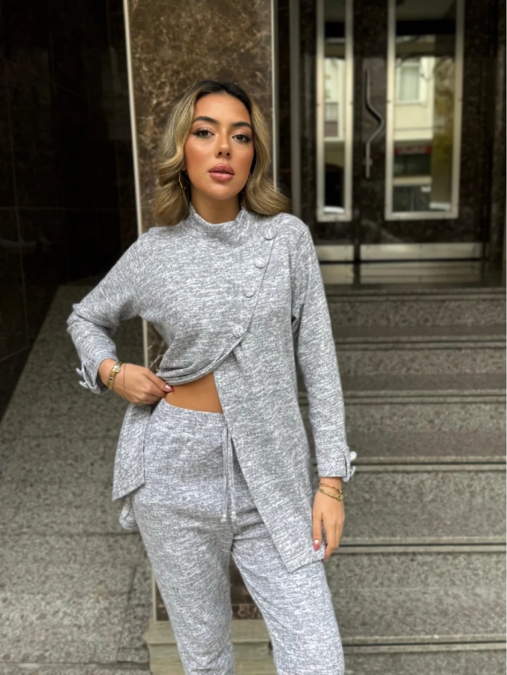 Kadın Uzun Kollu Balıkçı Yaka önden Düğmeli Bluz Ve Pantolon Yumoş Ikili Takım